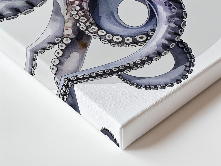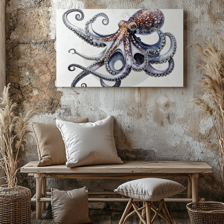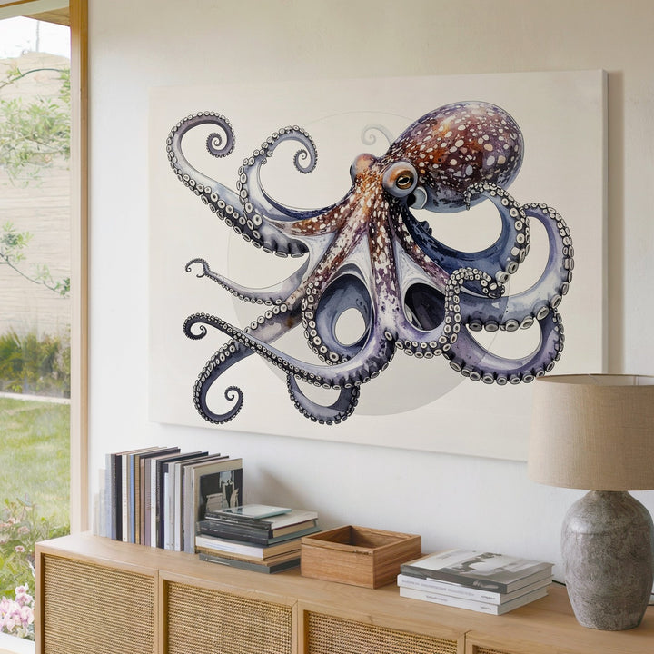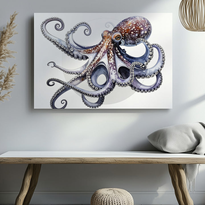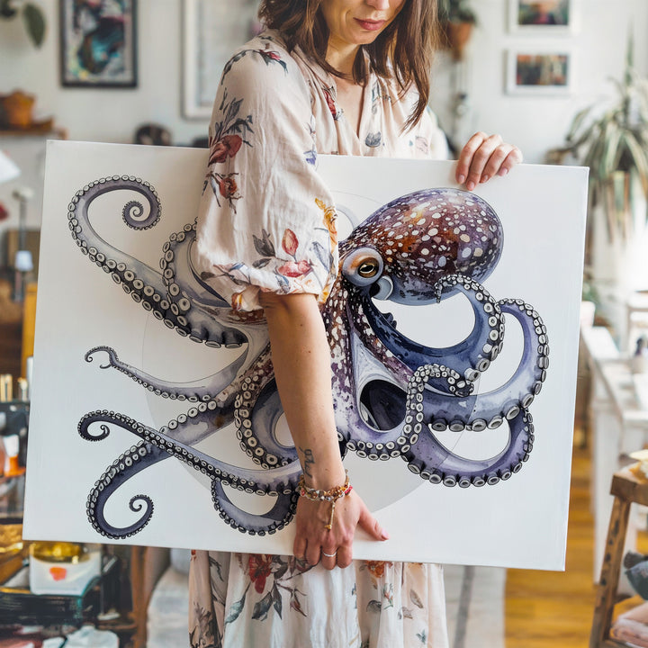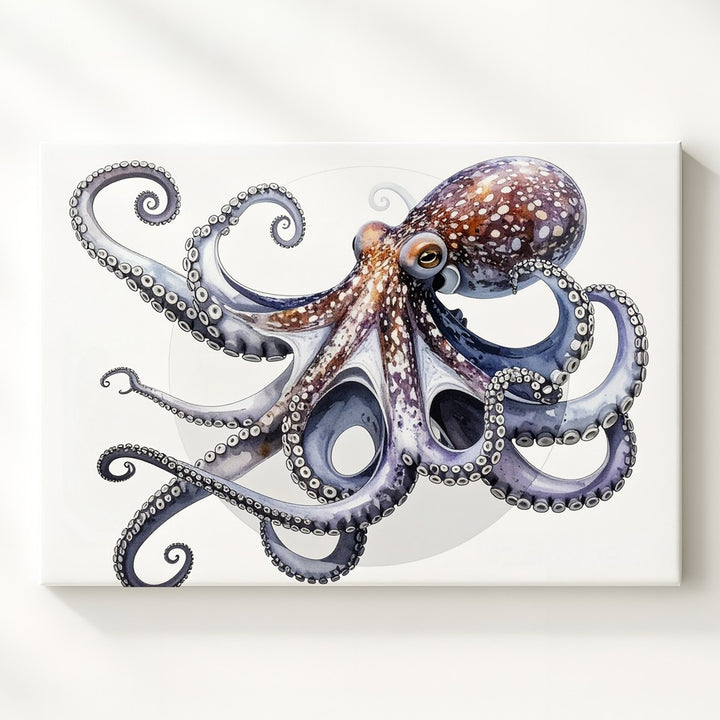 This highly realistic 3D-rendered canvas showcases a stunning octopus posed with gracefully curled tentacles against a clean white background accented by a soft gray circular halo. Rich purples, blues, and pinks blend seamlessly across its textured, rubbery skin, while lifelike reflections and smooth transitions add depth and realism. The octopus’s expressive eye gazes outward, capturing curiosity and intelligence. A polished, modern piece perfect for scientific, decorative, or conceptual art lovers.