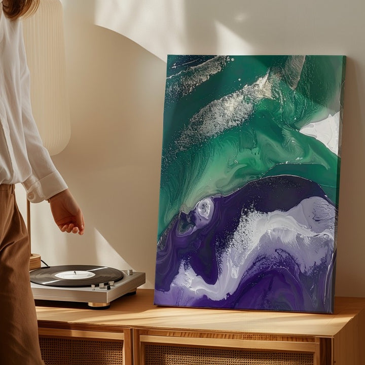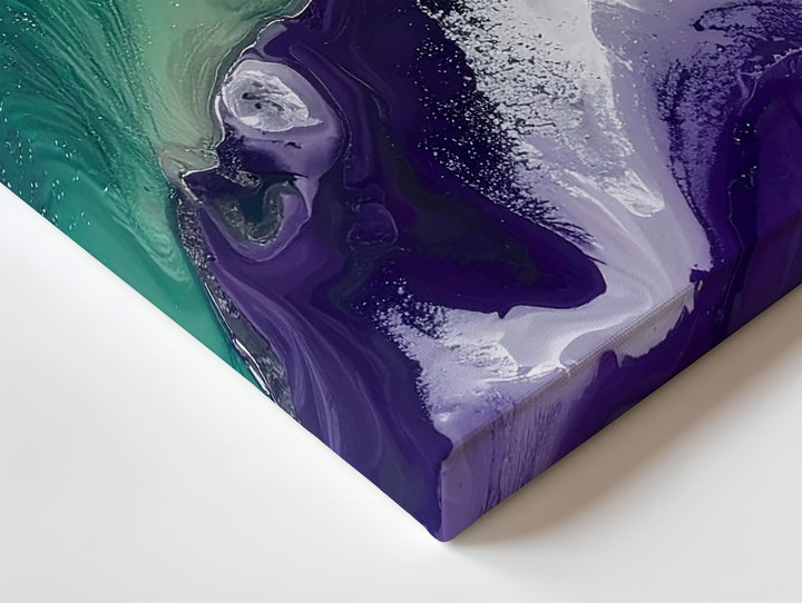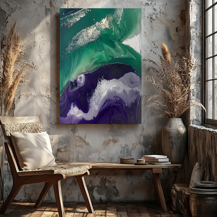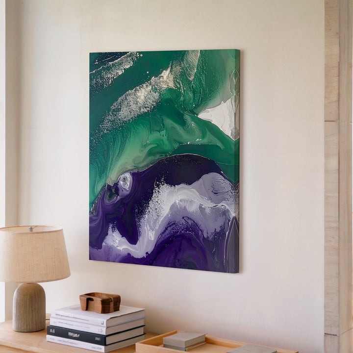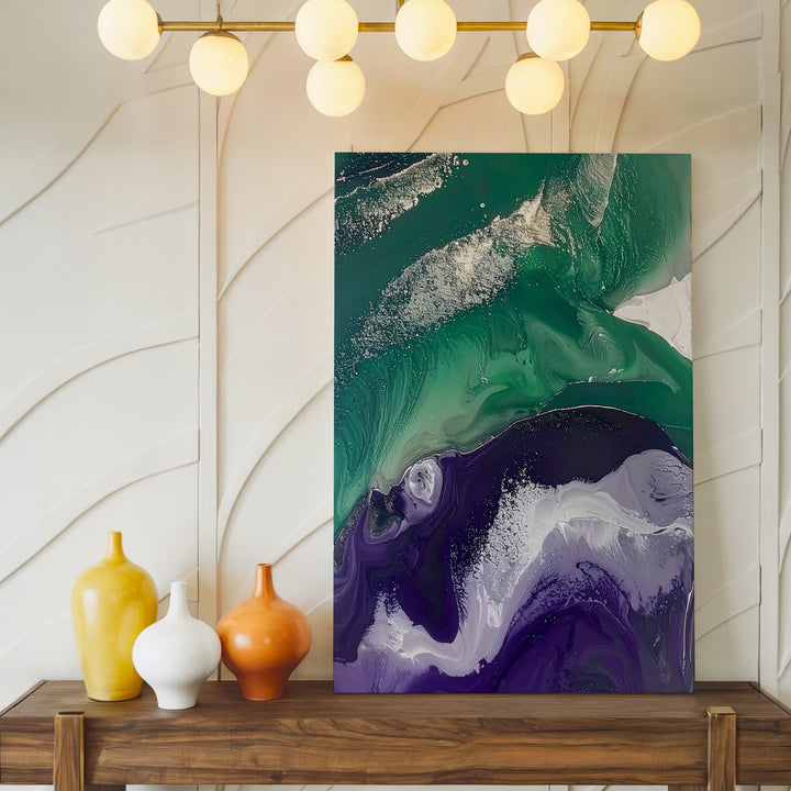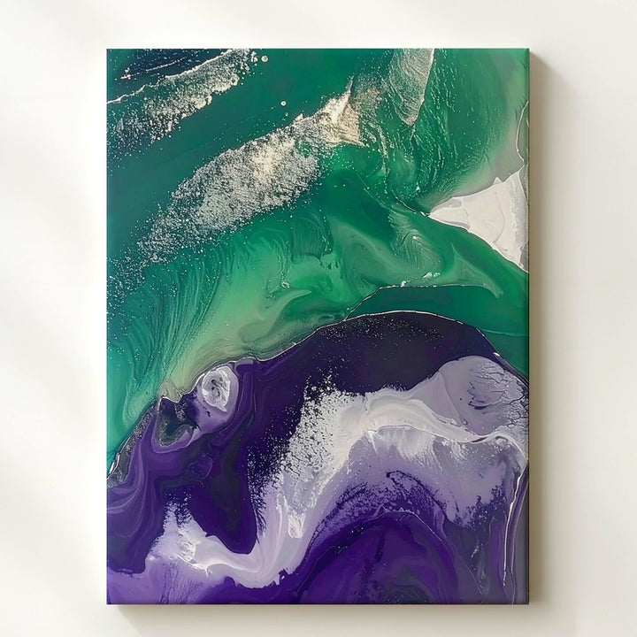 This striking artwork features swirling patterns in shades of green, white, and dark purple, resembling fluid underwater currents or aerial landscapes. The smooth, undulating forms and marbled transitions between colors are complemented by hints of metallic sheen, giving the piece depth and complexity. The glossy texture and natural drips create a sense of motion, as if the paint is frozen mid-flow. With its contemporary and meditative feel, this non-representational piece adds a touch of artistic sophistication to any modern interior.