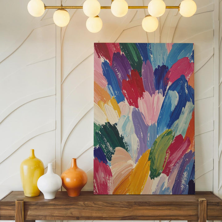 Bursting with color, this abstract painting features bold and expressive brushstrokes in blue, pink, purple, green, and yellow. Each stroke dances across the canvas, overlapping and layering to create a dynamic, textured composition full of energy and movement. The absence of distinct forms invites the viewer to experience the piece emotionally, allowing them to interpret the flowing shapes in their own personal way. This lively artwork is perfect for bringing a burst of color and positivity to any space.