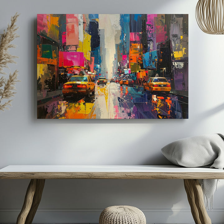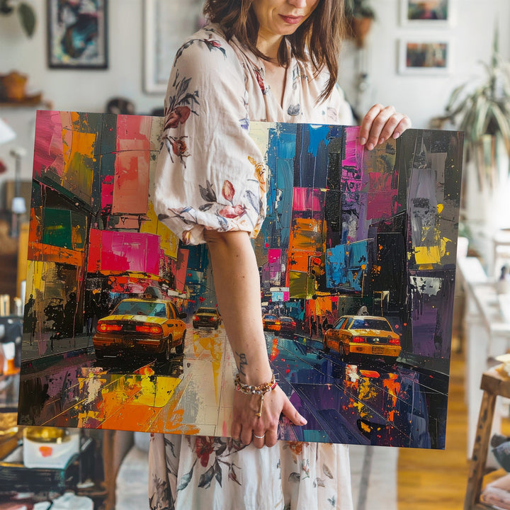 This electrifying canvas captures the pulse of a neon-lit city street, where bold brushstrokes and vivid hues collide in controlled chaos. Hot pinks, yellows, and electric blues flash across rain-slicked pavement, while blurred headlights and taillights carve paths of motion through geometric towers and glowing signs. It’s a fast-moving visual symphony of light, noise, and untamed energy—urban life turned into pure expression.