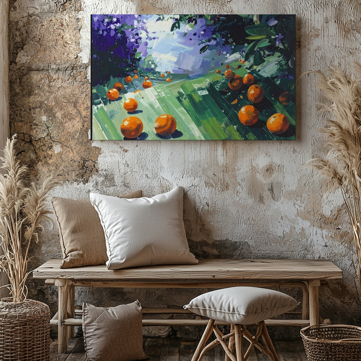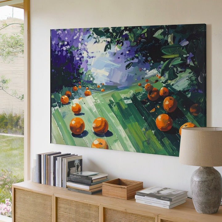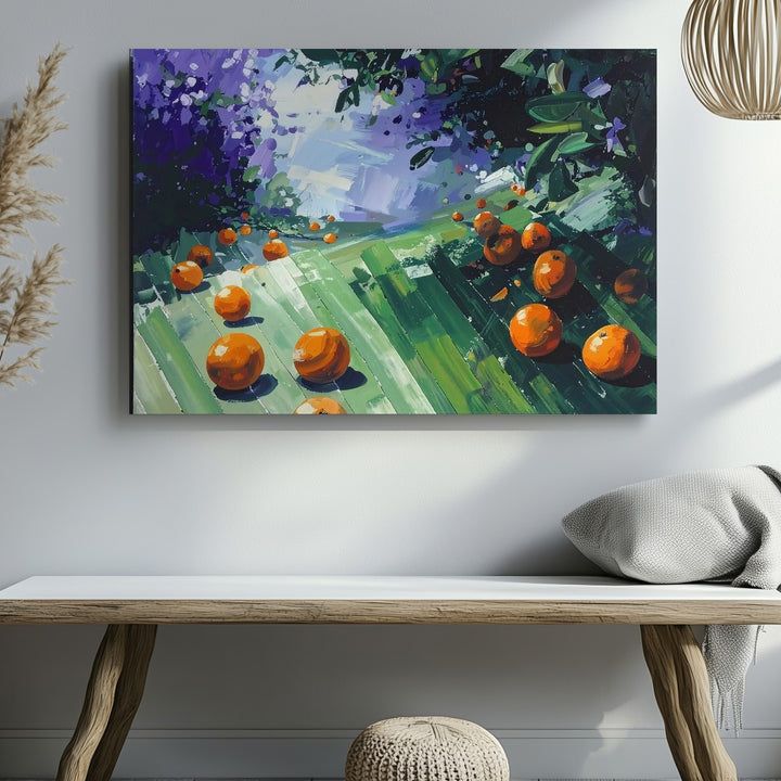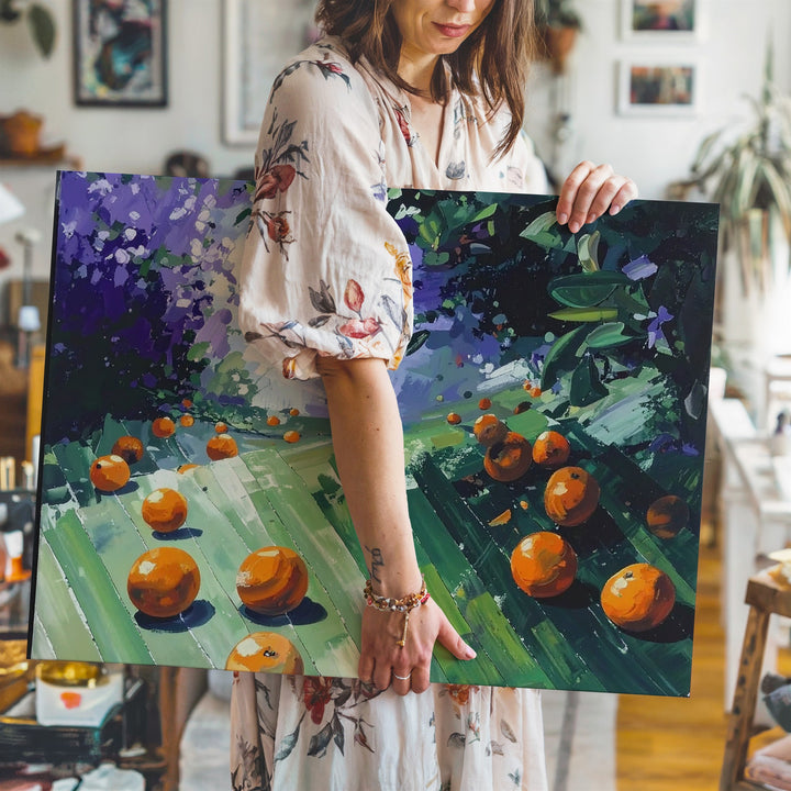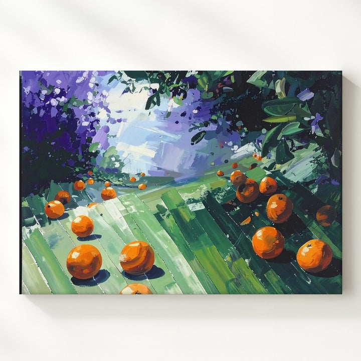 This semi-abstract canvas bursts with life, featuring vivid orange fruits scattered like playful thoughts across a green-and-white striped surface. The scene is set in motion by bold diagonal brushstrokes of lavender, white, and deep green—creating the illusion of a breeze, a memory, or a dream in motion. Each tangerine glows with textured paint, casting soft shadows that suggest lighthearted spontaneity and joyful energy.