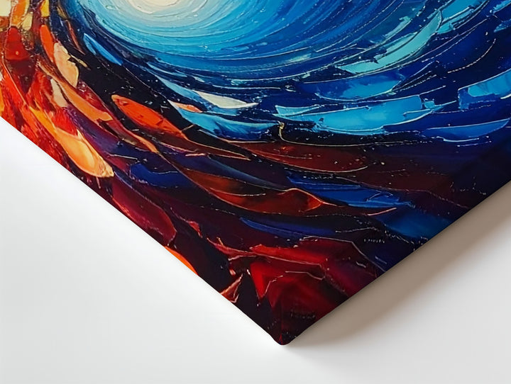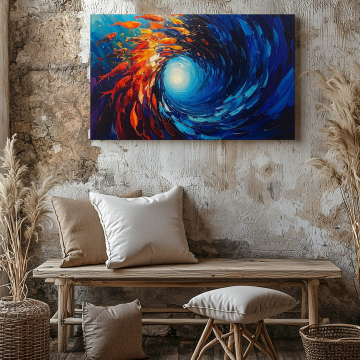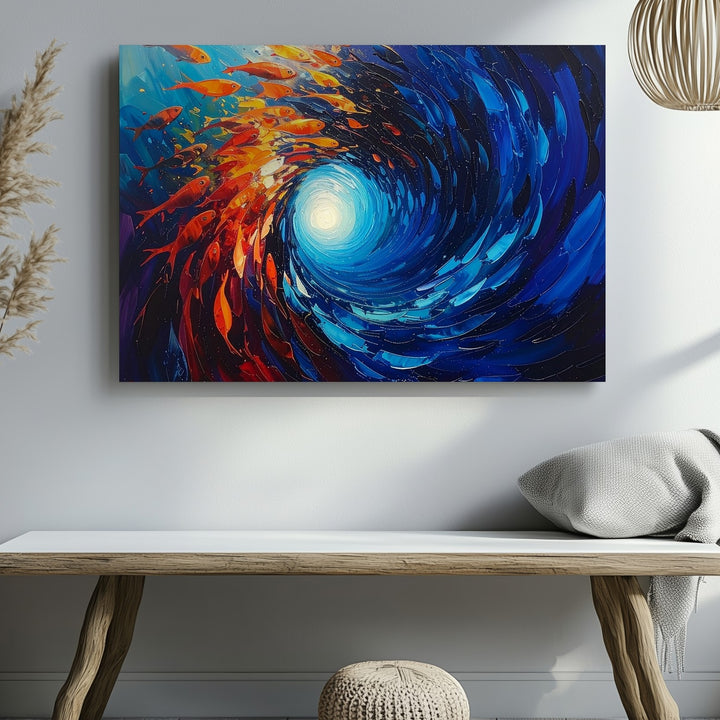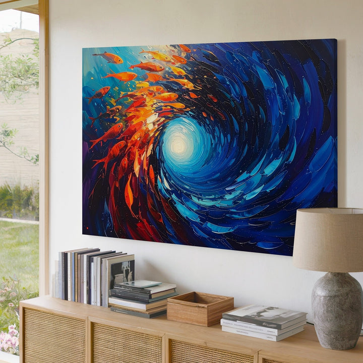 Vortex of Life Canvas – Abstract Swirling School of Colorful Fish