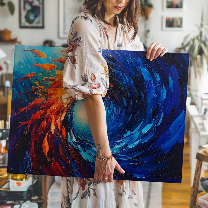 This electrifying underwater canvas captures the wild beauty of marine motion: a swirling school of vibrant fish—painted in red, orange, yellow, and blue—spirals into a living vortex. Fluid brush strokes and overlapping forms create a mesmerizing dance that pulses with energy. Set against a deep gradient of blues and purples, the scene blends abstract art with the rhythm of the sea, evoking a world where motion and mystery never rest.