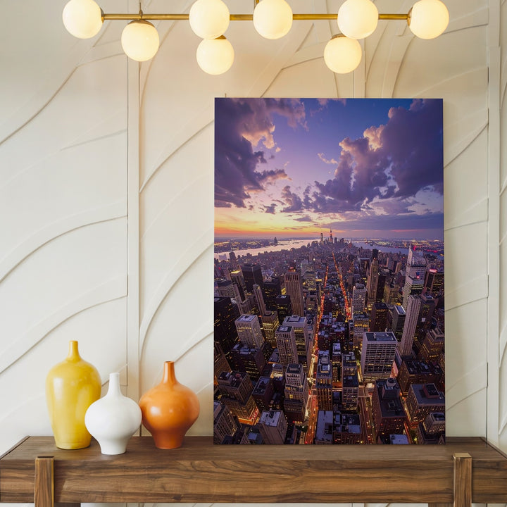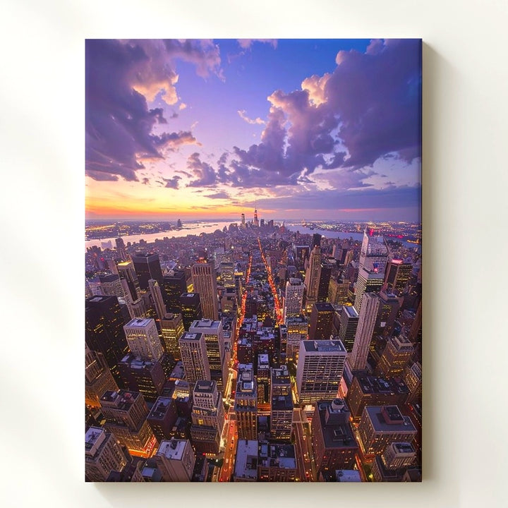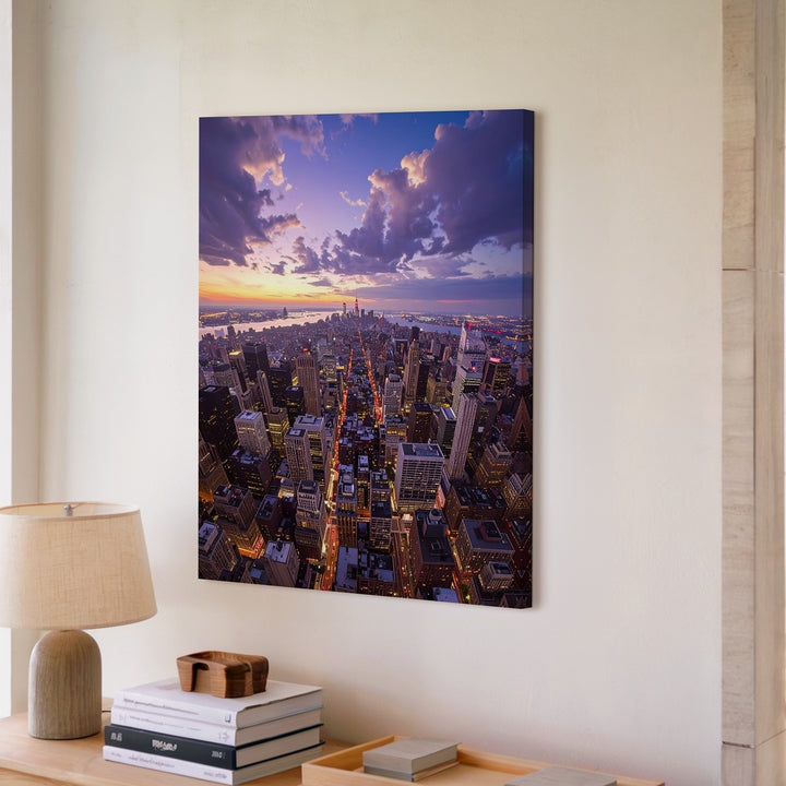 This awe-inspiring canvas captures a dramatic aerial view of a dense urban cityscape at sunset. Tall skyscrapers dominate the composition, their glass windows reflecting the soft golden and purple hues of the setting sun. Below, streets and avenues form a glowing grid, the lights snaking through the scene like veins, bringing the city to life. The wide-angle perspective emphasizes the vastness of the metropolis, while the sky transitions from deep blue to warm oranges and pinks, adding contrast and depth to the cool, structured city below. A powerful representation of modern urban life and human achievement, perfect for those who admire the beauty and scale of city living.