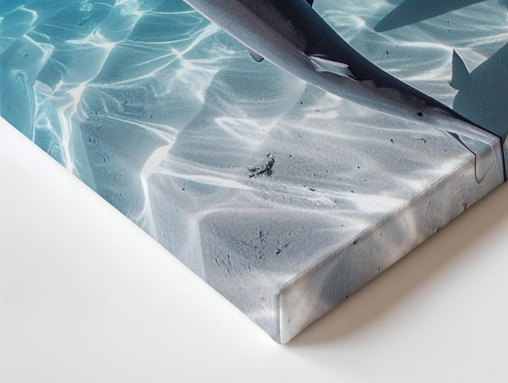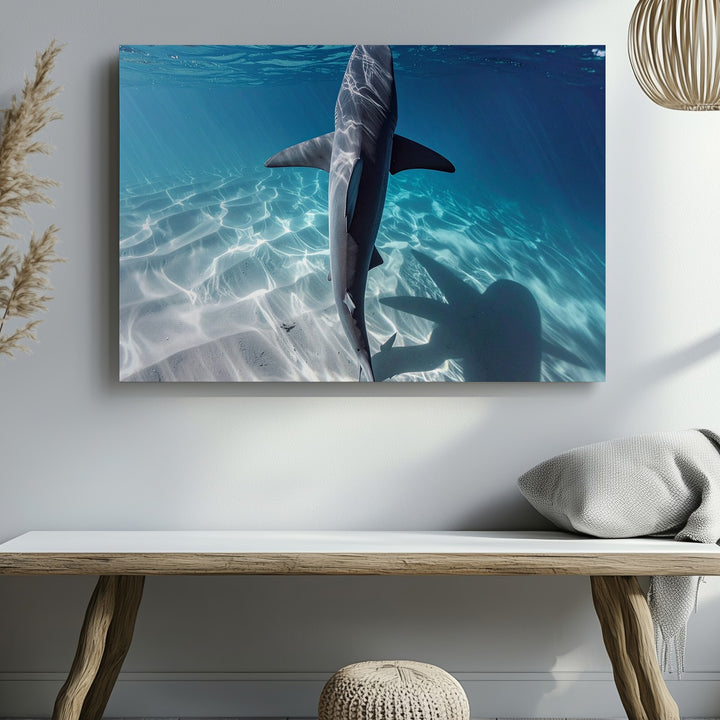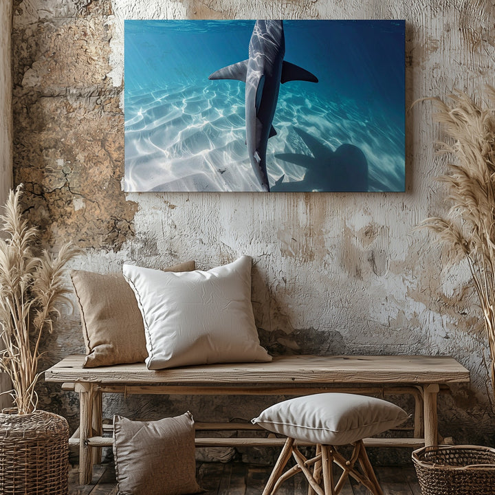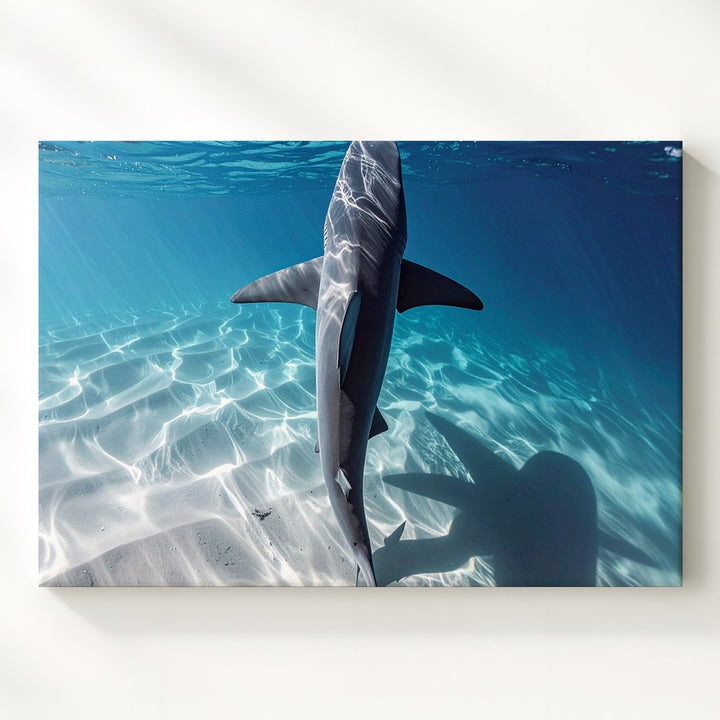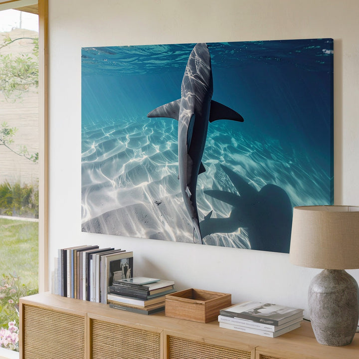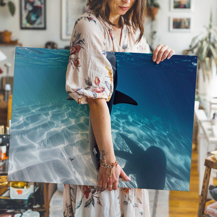 This stunning top-down canvas captures a lone shark drifting through shallow, turquoise waters, bathed in sunlight. Rippling light patterns dance across the seafloor, while the shark casts a soft shadow that stretches beneath its streamlined body. The image is minimal yet rich in emotion—evoking grace, solitude, and the quiet strength of nature undisturbed. A poetic study in presence, space, and fluid movement.