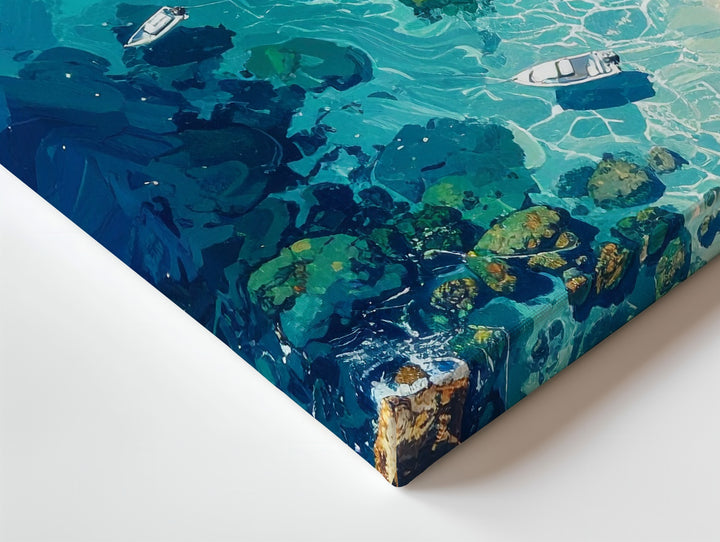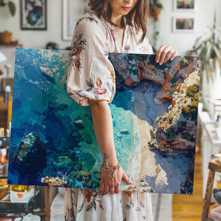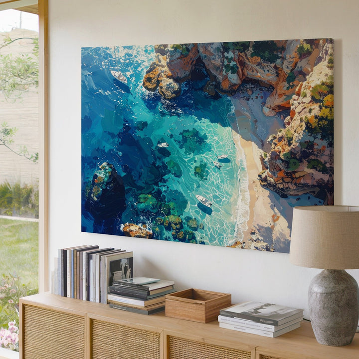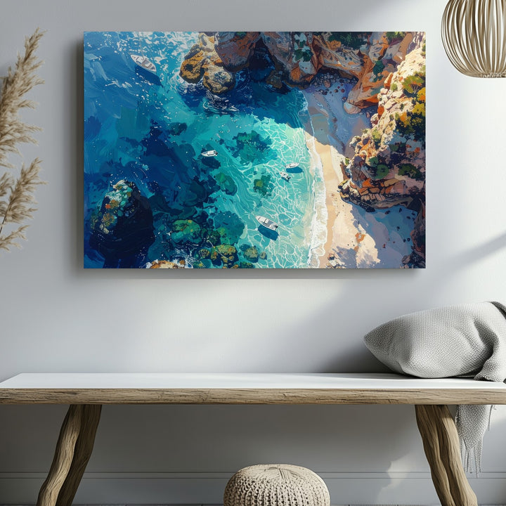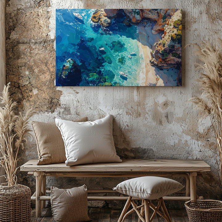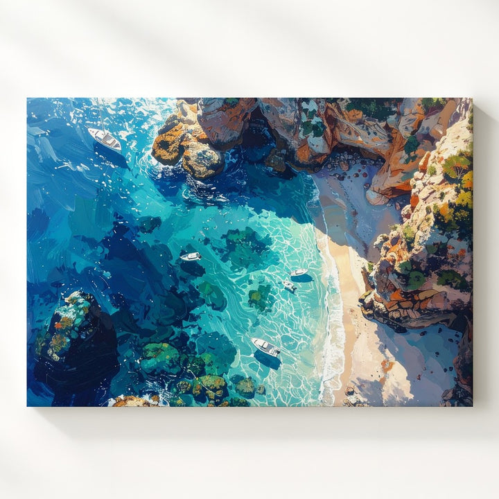 This stunning aerial canvas captures a bird’s-eye view of a dreamlike tropical shoreline—where turquoise shallows melt into deep ocean blues, and coral formations shimmer beneath the glassy surface. Small white boats drift across the seascape, their delicate shadows adding to the sense of motionless peace. Rugged cliffs in warm orange and sandy tones hug the coastline, creating a breathtaking contrast between land and sea.
