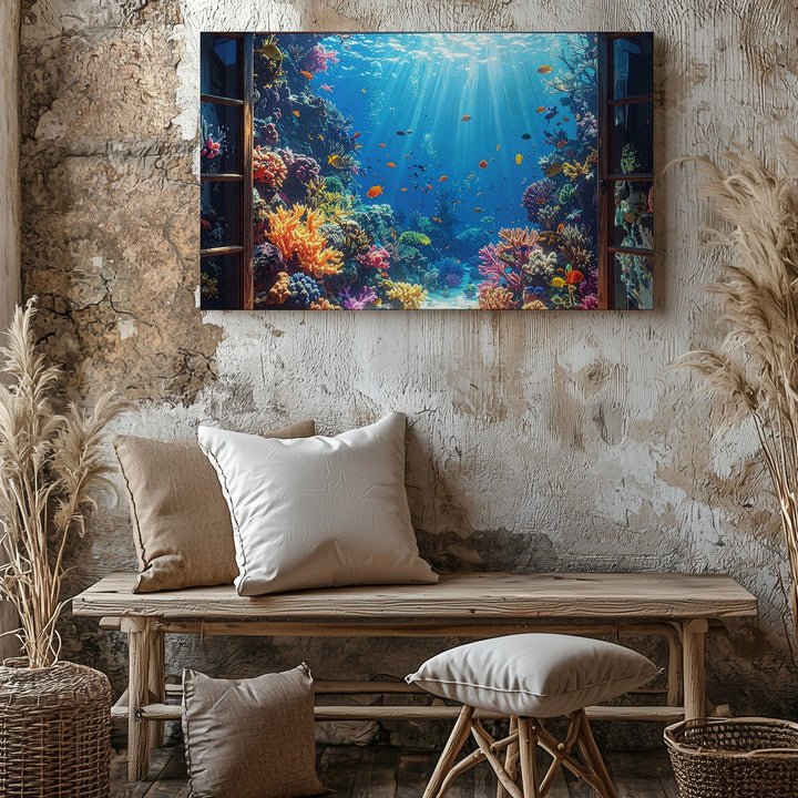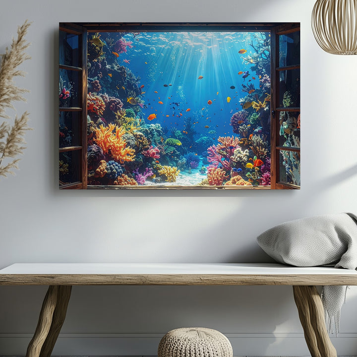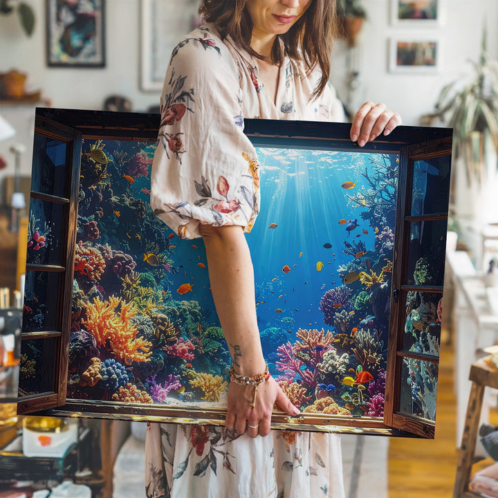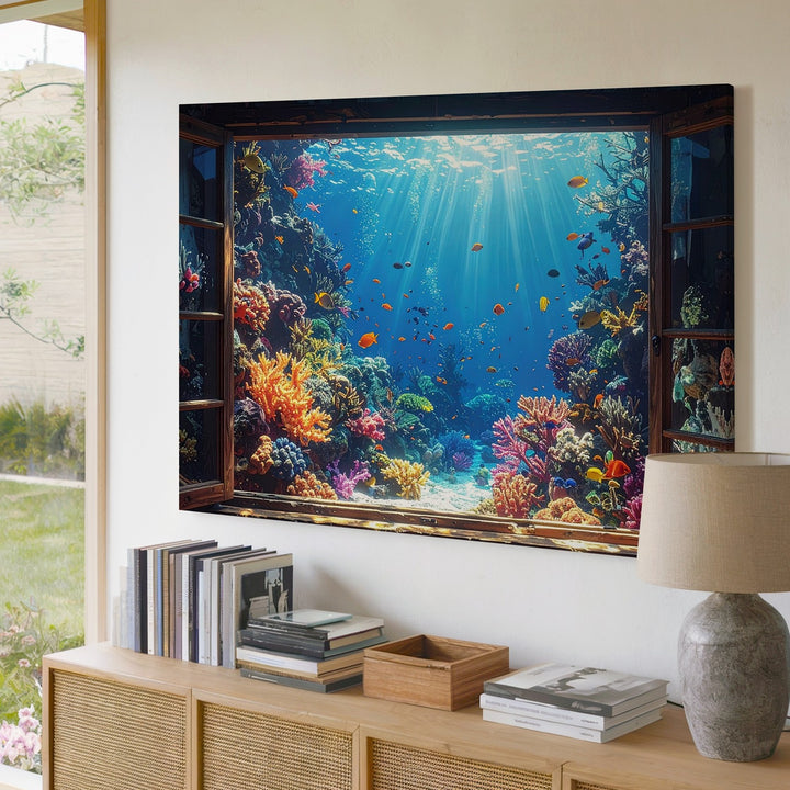 This vibrant digital canvas invites you to peer through an open window into a bustling coral reef alive with colorful tropical fish in orange, blue, yellow, and pink. Sunlight dances through the water, highlighting coral branches and swaying sea plants, while the wooden frame grounds the scene in cozy contrast. This immersive artwork blurs the line between home and ocean, bringing wonder, color, and life into your living space.