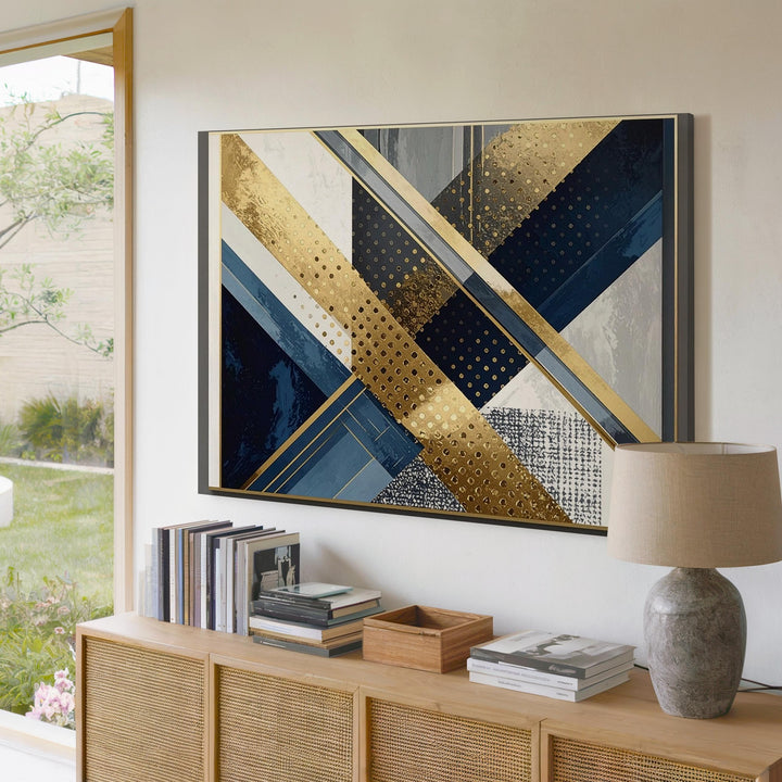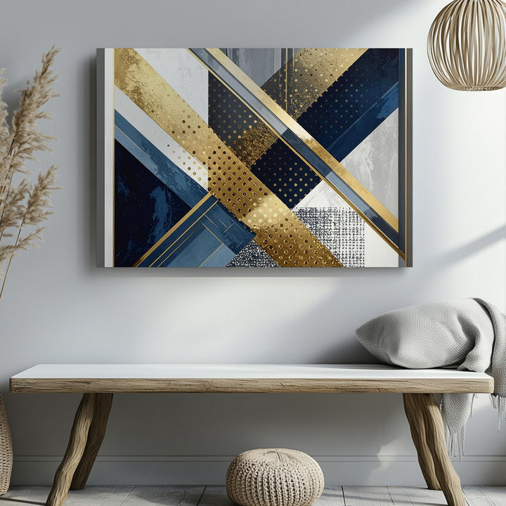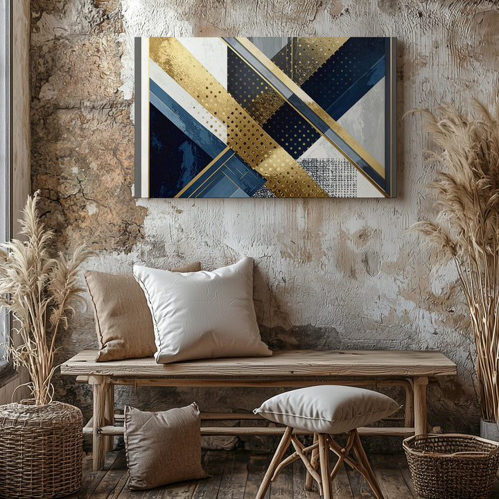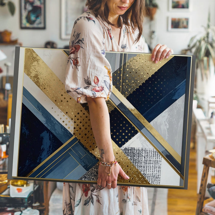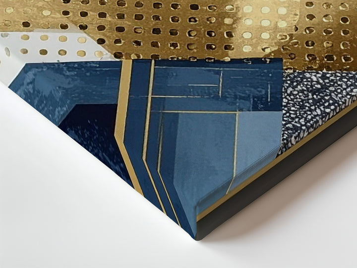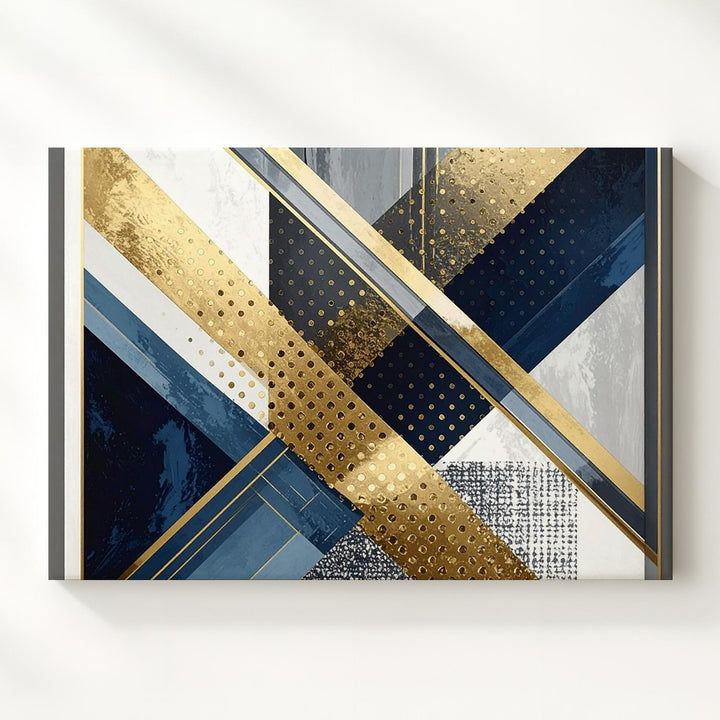 This contemporary geometric canvas features strong linear compositions, where diagonal planes in white, black, blue, and gold intersect with sharp precision, creating a dynamic sense of depth and direction. A dotted gold triangle pattern overlays part of the blue section, adding texture and visual interest. The high-contrast palette, including bold shadows and light gray tones, enhances the structural feel of the piece. Framed by a slim white border, the artwork exudes a modern, architectural aesthetic, evoking a technical and graphic sensibility with its precise layout and clean lines.