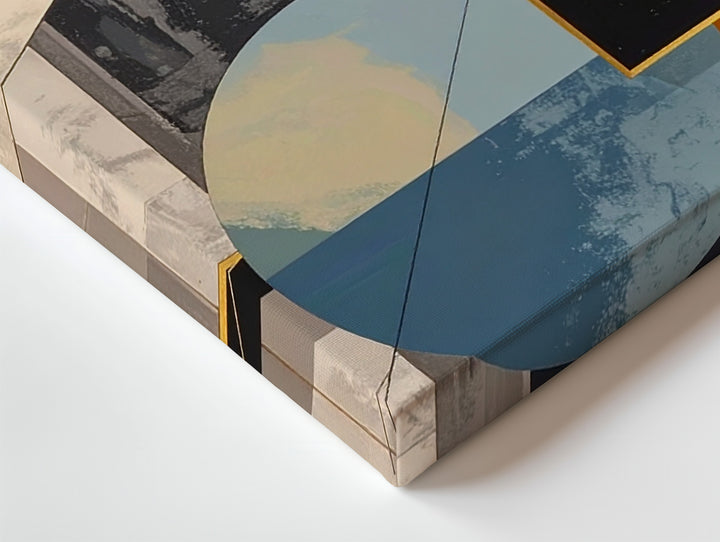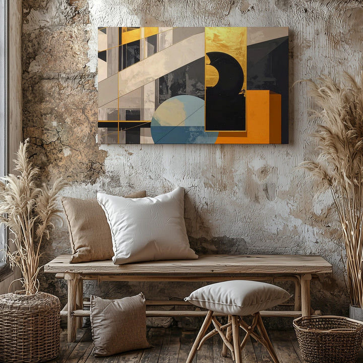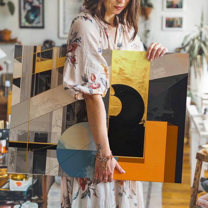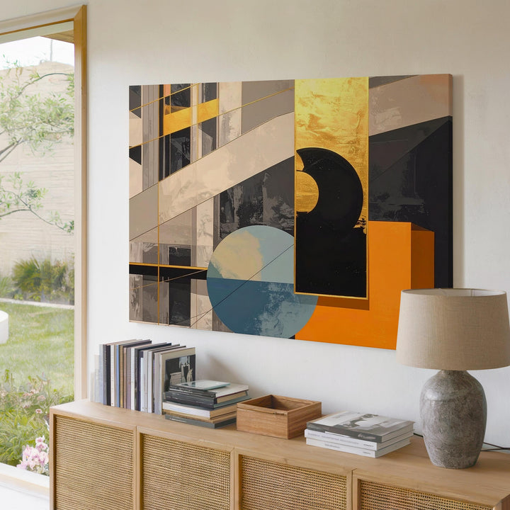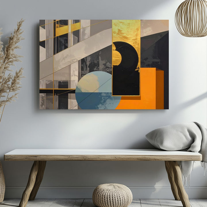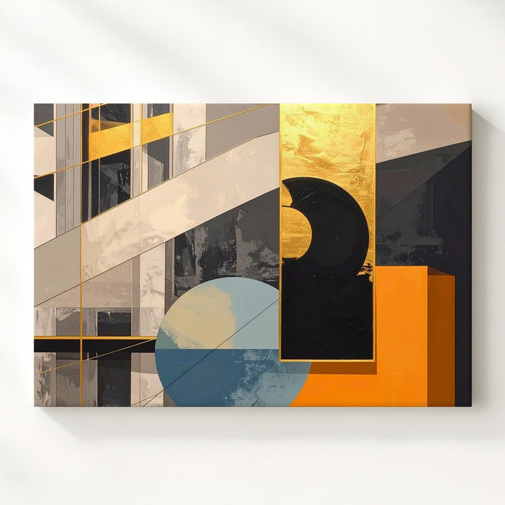 This sleek geometric canvas fuses the clean lines of architecture with bold graphic design. Grayscale building textures with curved glass reflections form the backdrop, while a matte orange block anchors the lower right. A striking gold vertical strip slices through the center, intersecting a black circle and muted blue shapes to create a layered, visually commanding piece. The balance of symmetry, contrast, and modern texture turns industrial calm into contemporary elegance.