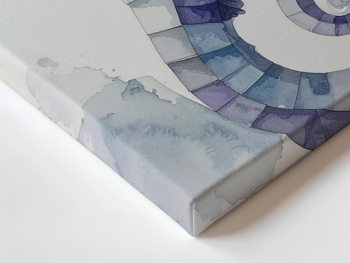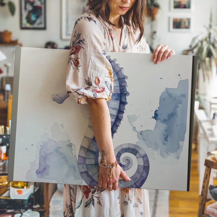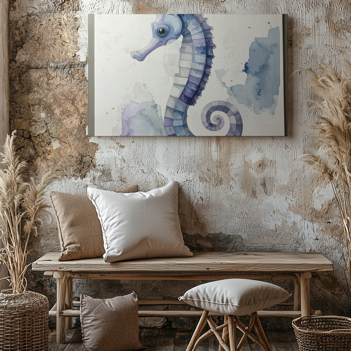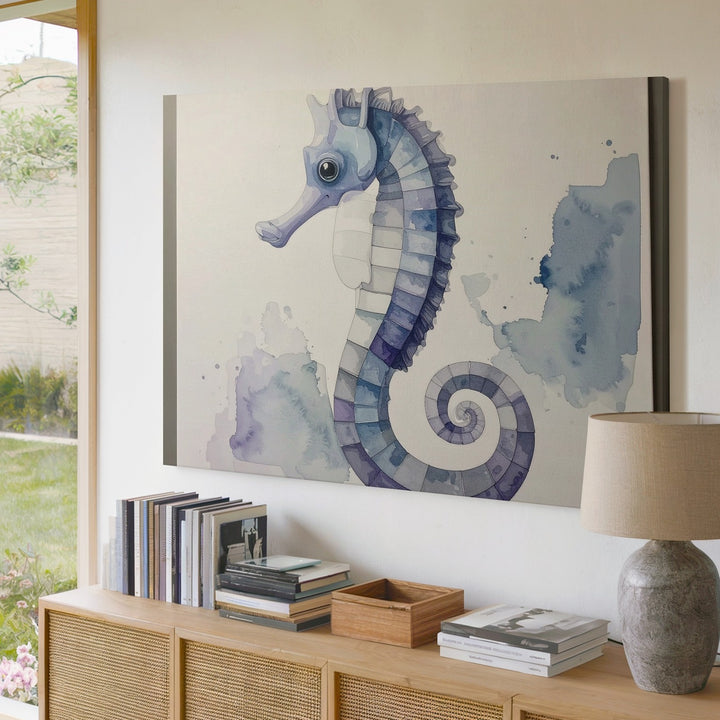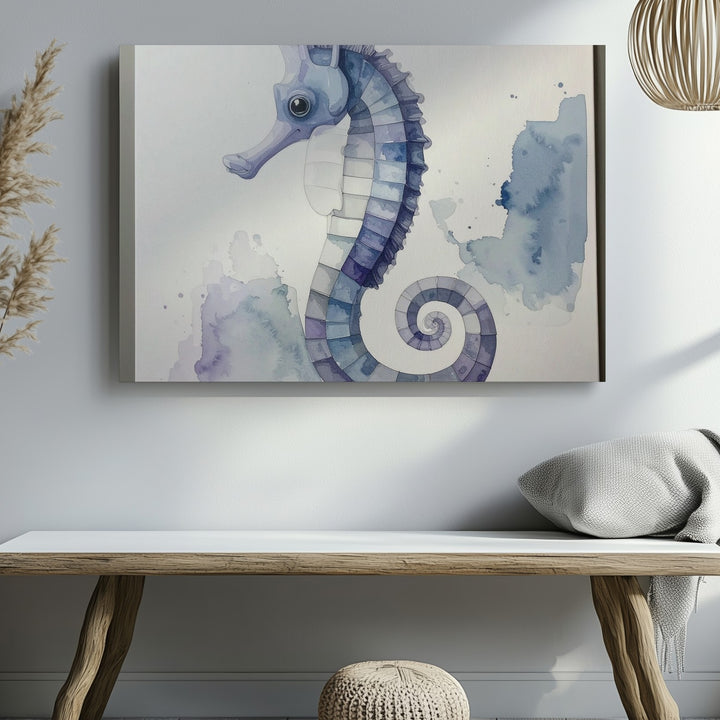 This adorable watercolor-style canvas features a baby seahorse in gentle shades of blue, purple, and gray, with a slight smile and softly curled tail. The illustration is detailed yet delicate, with subtle gradients and playful splashes that float behind on a clean white background. Its charm lies in simplicity—an inviting underwater friend that brings warmth, innocence, and calm to any space.