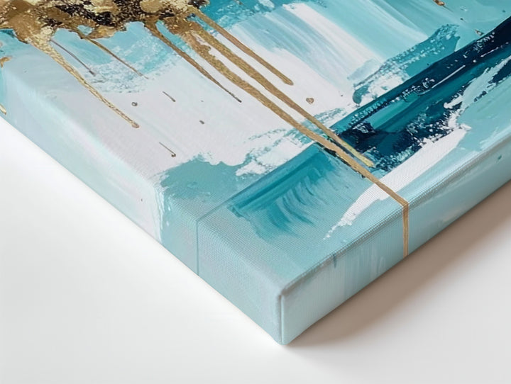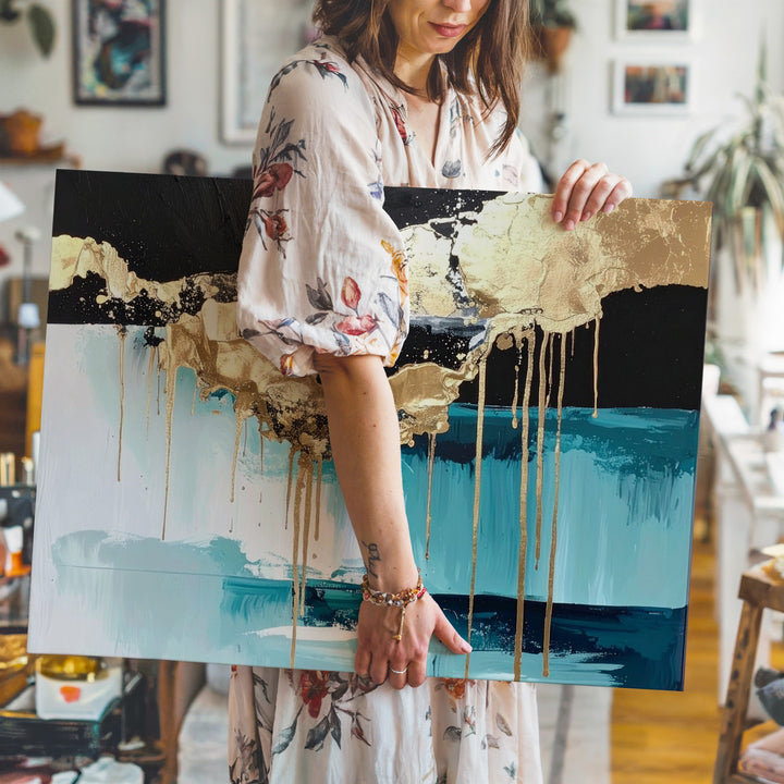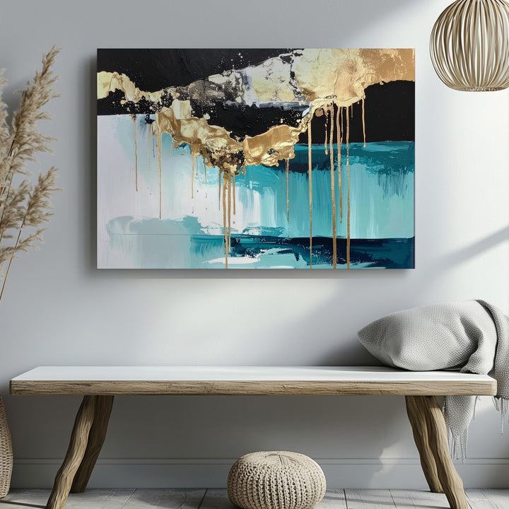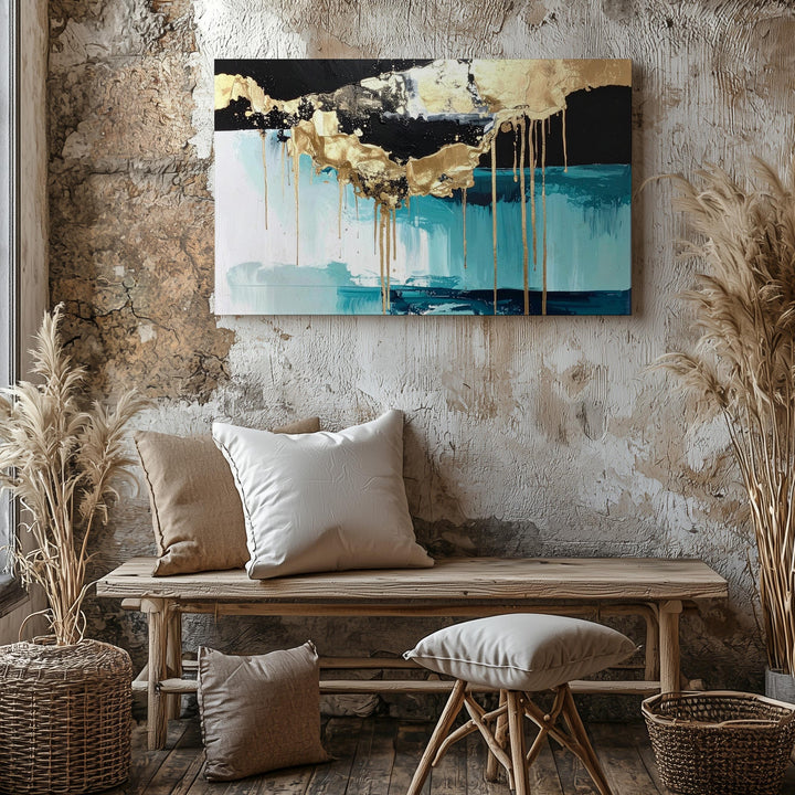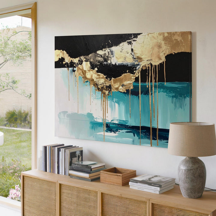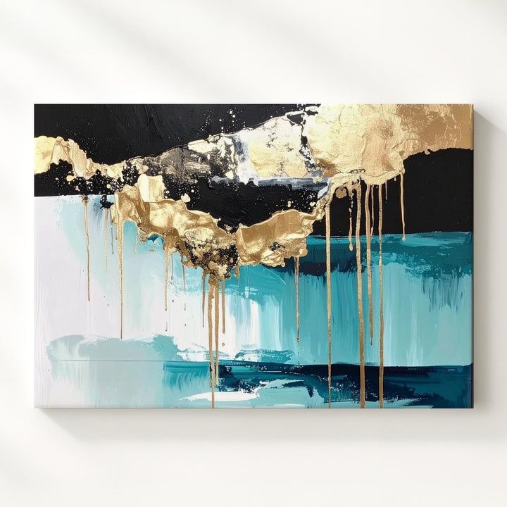This striking abstract canvas unites bold black, serene aqua, and radiant gold in a composition that feels both grounded and free. The flat black upper half anchors the piece, while a soft aqua-to-white gradient breathes light below. Between them, jagged gold streaks drip like liquid light—bridging intensity and calm with luxurious detail. This artwork turns contrast into connection, and simplicity into statement.