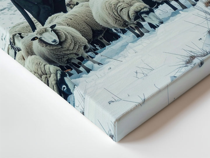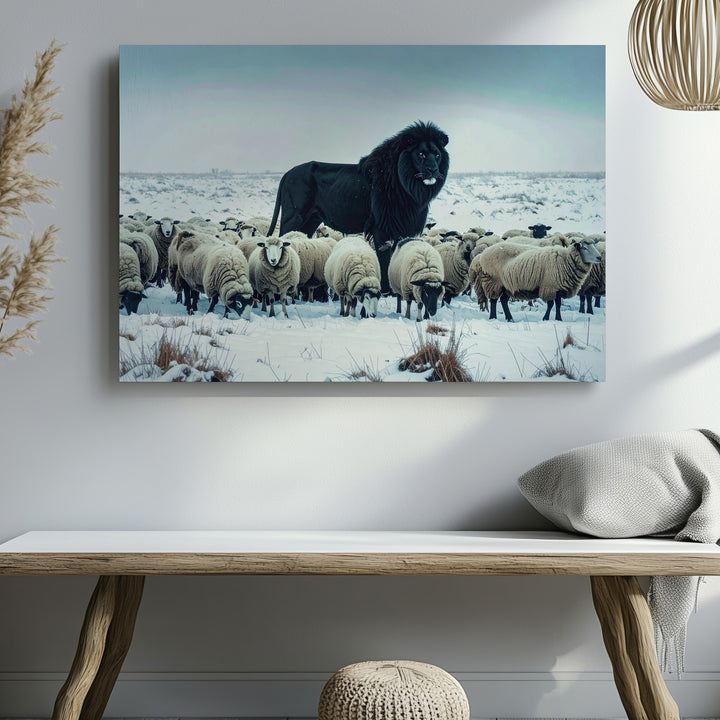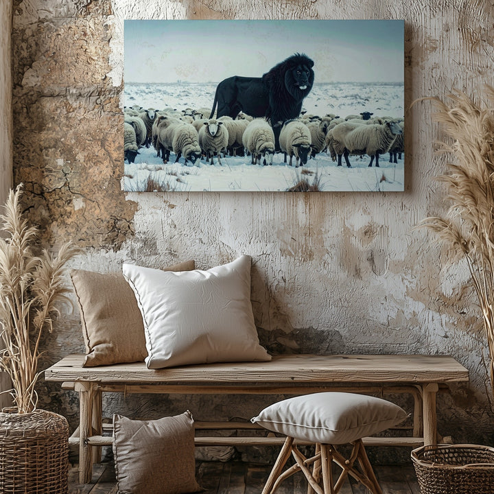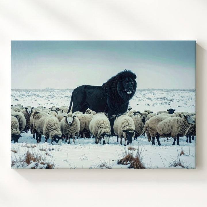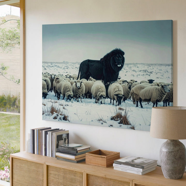 Black Lion Among Sheep Canvas – Symbolic Winter Scene of Power & Stillness