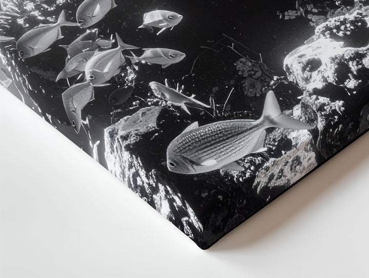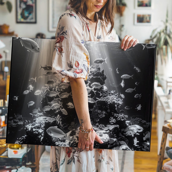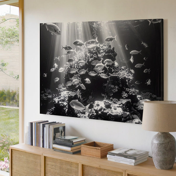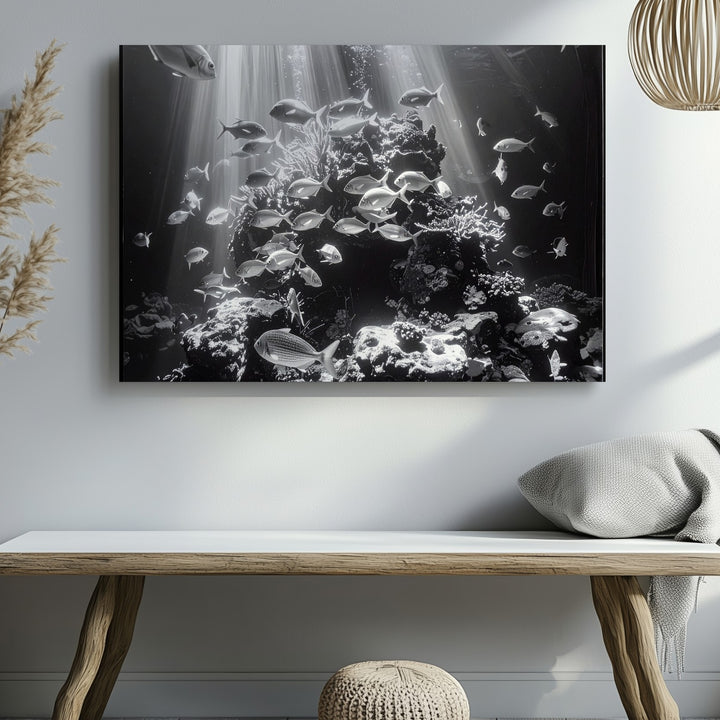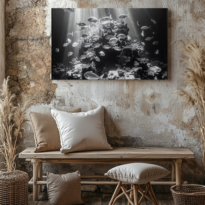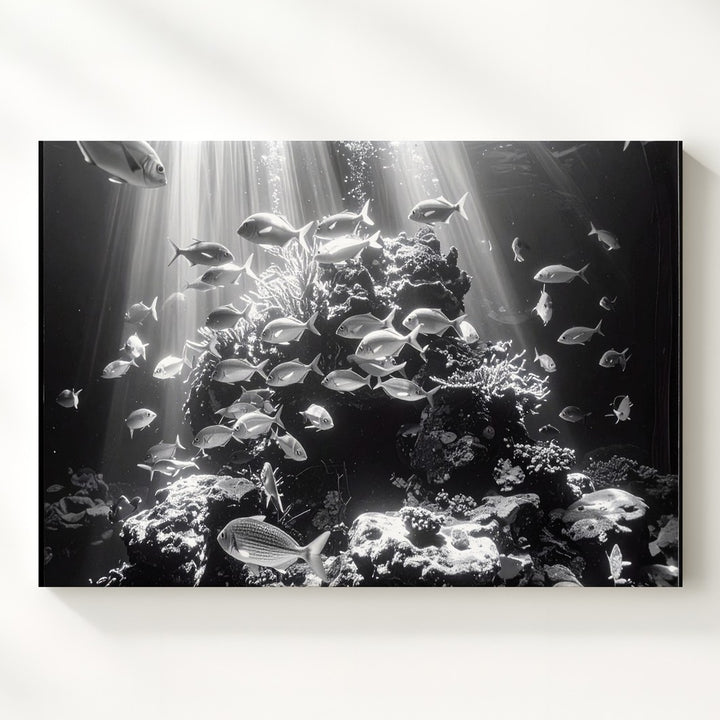 This elegant black-and-white underwater canvas freezes a moment of natural choreography: a dense school of small fish swirling around a coral-covered rock formation. A dramatic beam of light pierces the darkness from above, illuminating shimmering scales and the textured reef below. The monochrome palette heightens every detail, turning this living pattern into a timeless visual meditation on movement, unity, and the quiet power of the sea.