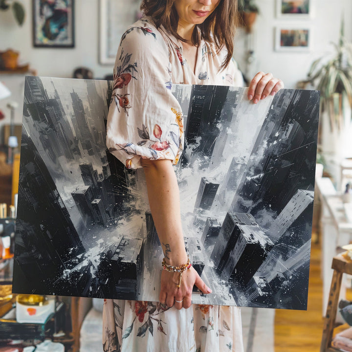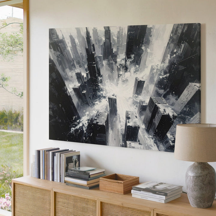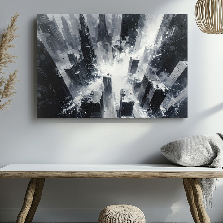 This striking black-and-white canvas captures a vertigo-inducing view of a chaotic city from above, centered around a blinding burst of white light. Towering skyscrapers stretch and dissolve into sharp streaks, as if time and structure are unraveling. With its intense contrast, rough textures, and sense of motion, this piece embodies the overwhelming scale and explosive dynamism of urban life in abstract form.