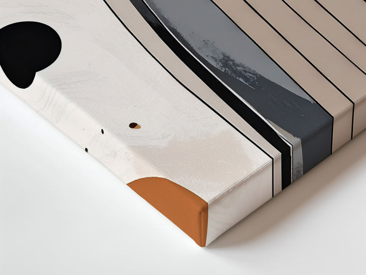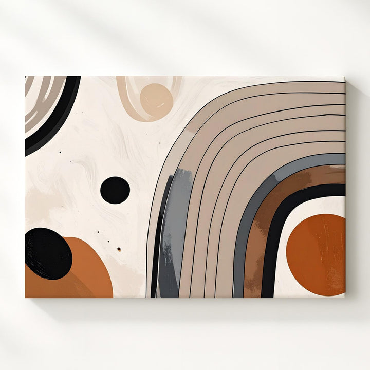 This modern abstract canvas blends bold curves with grounded color to create a sense of balance and flow. Thick black arcs rise upward like pathways or echoes, contrasted by warm terracotta circles and a single solid black dot. Set against a creamy background, the piece evokes calm strength, minimalist design, and earthy sophistication—perfect for spaces that celebrate clarity and warmth.
