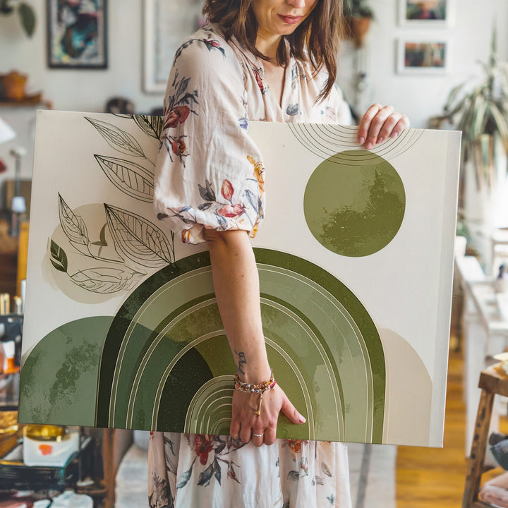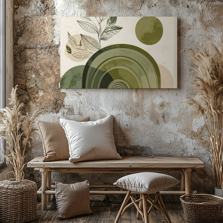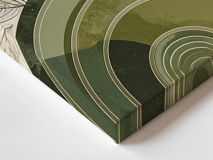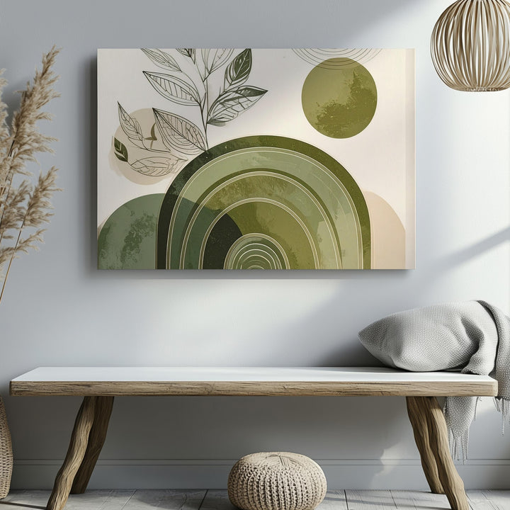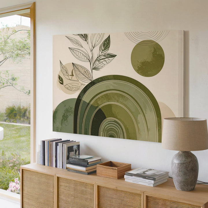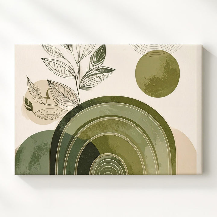 This minimalist canvas fuses botanical grace with modern geometry: a leafy black line drawing stretches upward alongside a concentric olive green arch—evoking hills, pots, or rooted stillness. A circular echo in the corner mirrors the arch, bringing balance and subtle movement to the cream-toned background. It's a thoughtful piece that honors both nature’s softness and structure’s calm.
