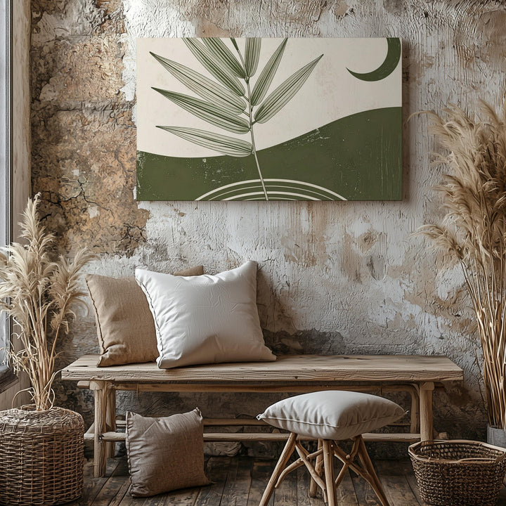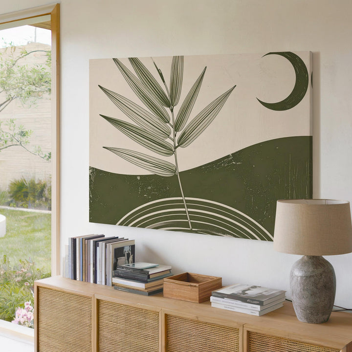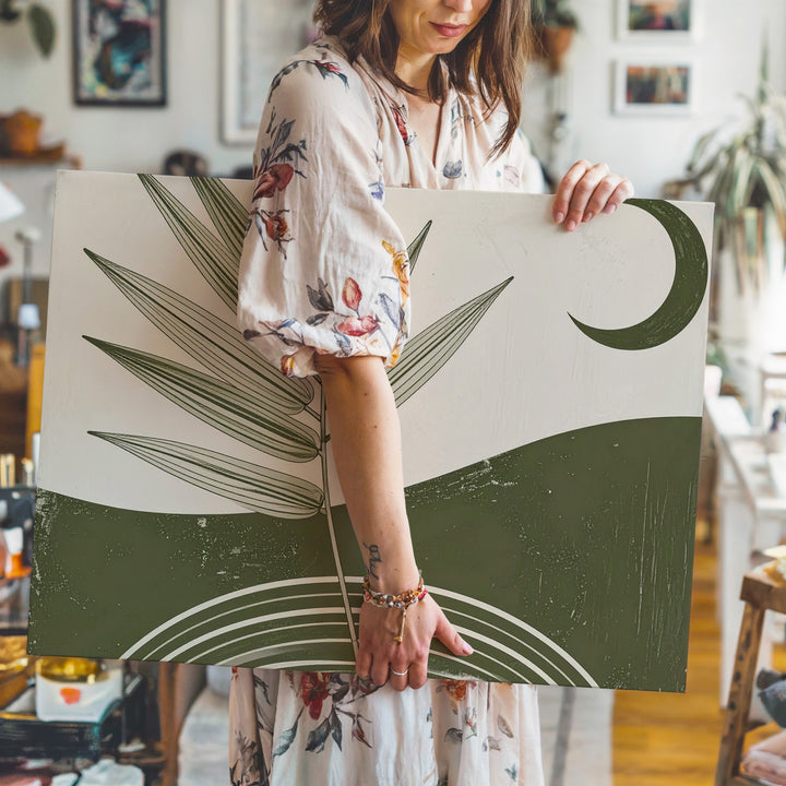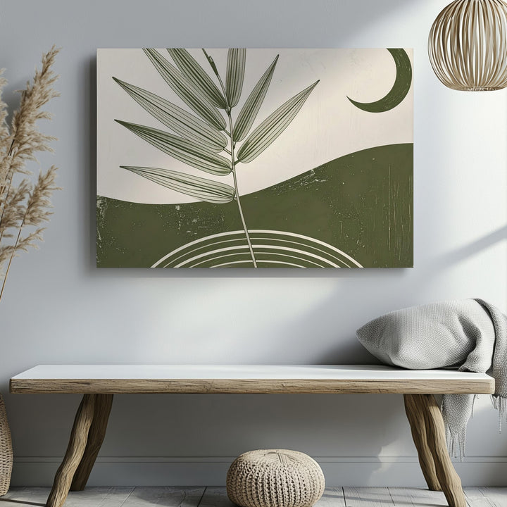 This elegant minimalist canvas blends geometry and nature into a single, poetic moment. Concentric green arches form a grounded base, from which a slender botanical branch reaches upward—its fine leaves tracing a path toward the dark green crescent moon above. Set against a soft beige background, the piece evokes quiet harmony between earth and sky, nature and the cosmos.