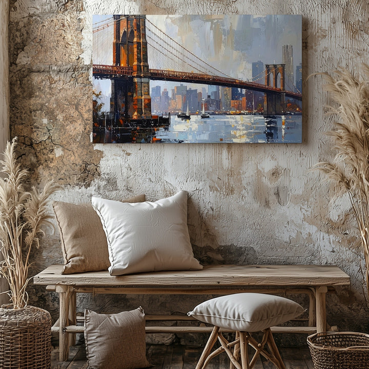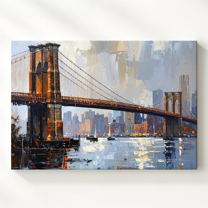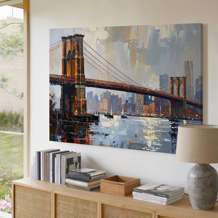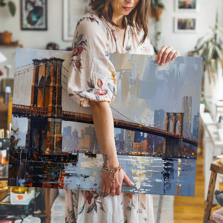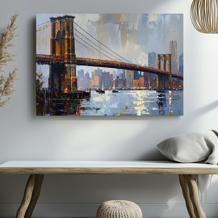 Brooklyn Bridge Twilight Canvas – Textured Cityscape with Reflections
