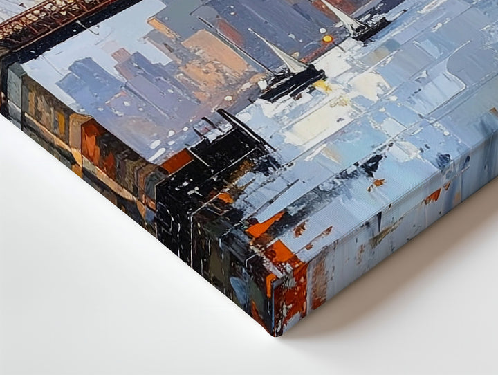 This richly textured canvas honors the iconic beauty of the Brooklyn Bridge at dawn or dusk. Expressive brushstrokes bring depth to its reddish-brown towers and suspension lines, while mist and subtle light streaks blur the city behind it. Reflections shimmer on the water like oil and glass, echoing the calm energy of a waking or winding-down metropolis. With boats drifting softly below and warm ochres meeting cool grays, this artwork bridges strength and stillness.