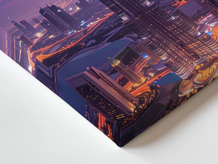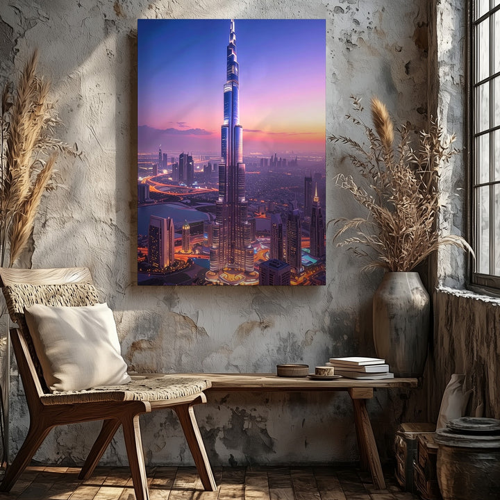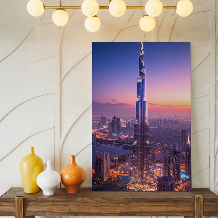This stunning vertical canvas showcases the towering Burj Khalifa, glowing against a breathtaking purple and orange sky as the sun sets over Dubai. The building’s reflective glass surface captures the colors of the sky, while the interior lights begin to flicker on, adding a warm contrast to the cool tones of the evening. Surrounding the Burj Khalifa, smaller high-rises create a sea of lights and silhouettes, further emphasizing the central beacon. The calm of twilight and the futuristic elegance of Dubai’s architecture combine to create a peaceful yet vibrant cityscape.