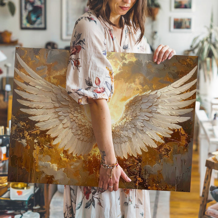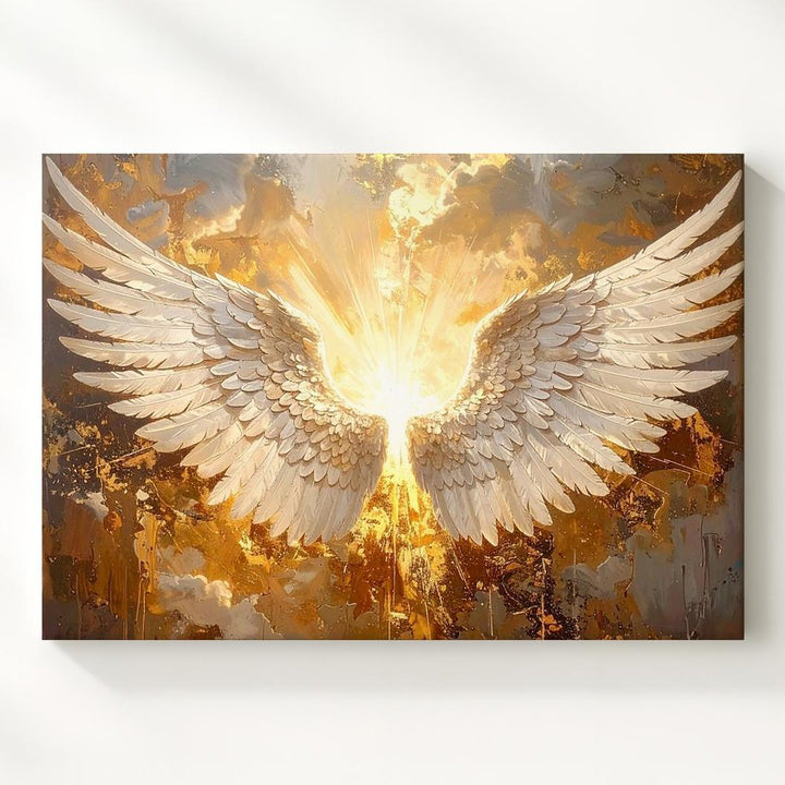 This breathtaking canvas depicts a pair of angel wings, their feathers delicately rendered in soft whites and creams, stretching wide against a rich, metallic gold background. Light bursts from between the wings, casting a heavenly glow that enhances the divine presence of this celestial image. With its intricate details and luminous glow, this piece captures the purity and transcendence of angelic grace, bringing an aura of protection and serenity to any space.