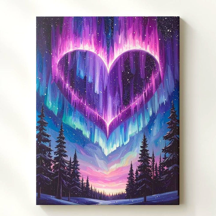 This magical digital artwork captures a large, glowing heart shape in the sky, as if an aurora of vibrant light—purples, pinks, and blues—shines against a star-filled night sky. Below, the silhouette of pine trees lines the horizon, framing the celestial heart in a scene that feels both ethereal and grounded. The painterly texture of the sky, brushed with cosmic light, creates a dreamlike atmosphere, while the heart’s soft edges blend seamlessly into the vast expanse above. This piece embodies wonder, love, and a deep connection with both nature and the cosmos.