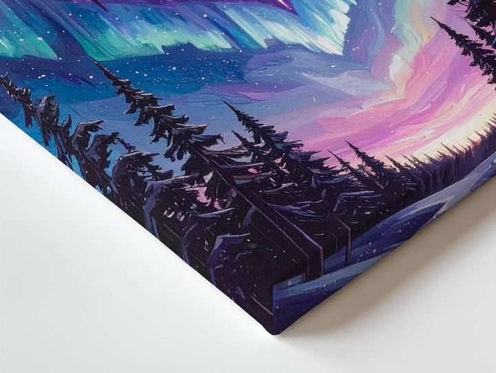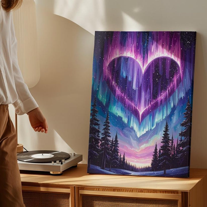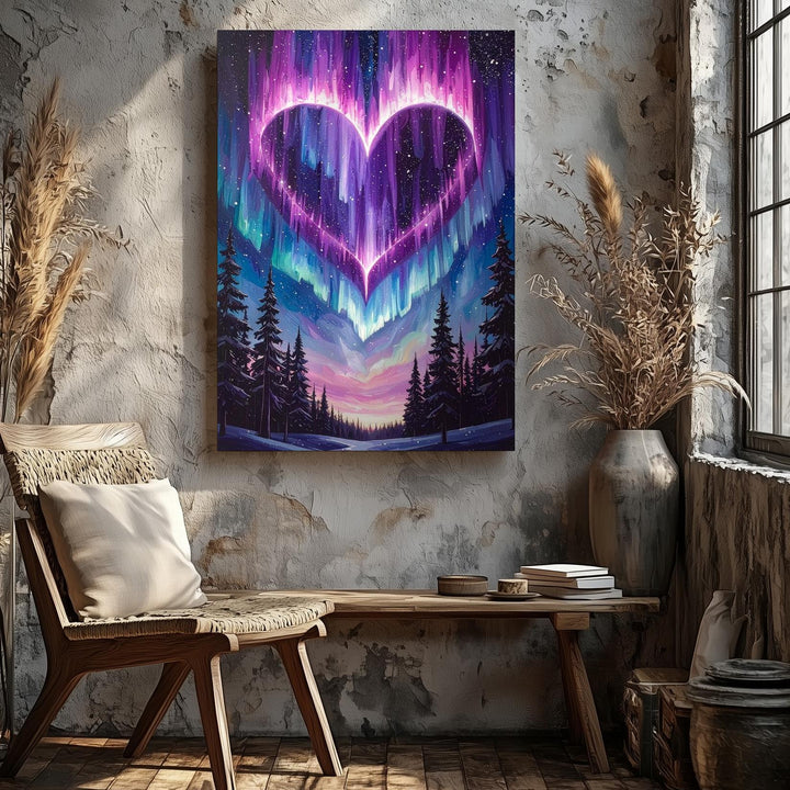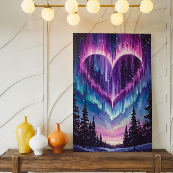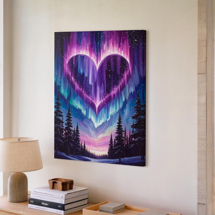 Celestial Heart Canvas – Glowing Heart in the Sky with Pine Tree Silhouette
