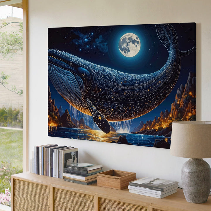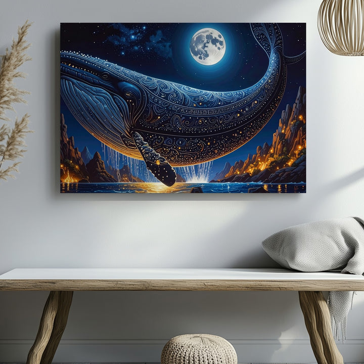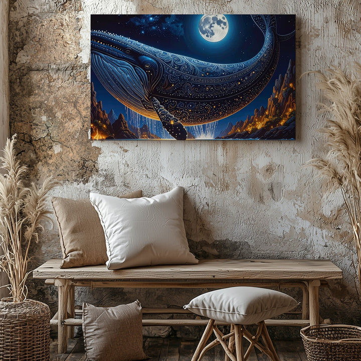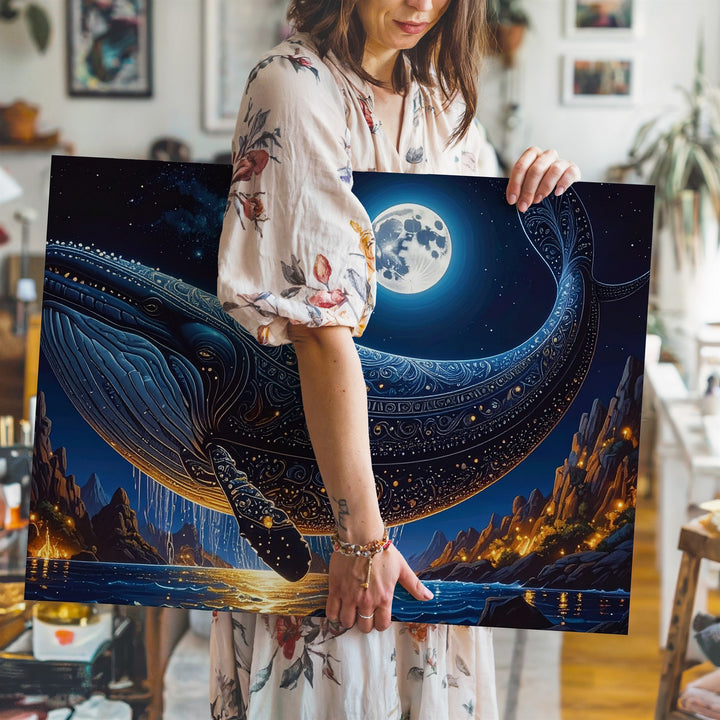 Celestial Whale Canvas – Fantasy Moonlit Sky & Cosmic Ocean Flight