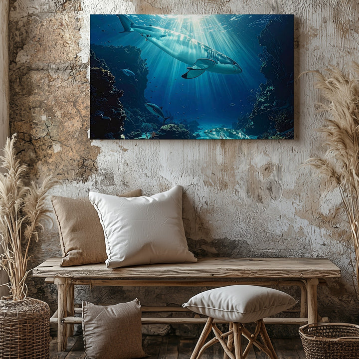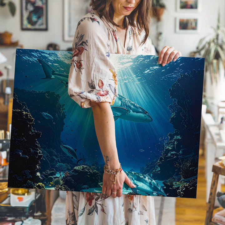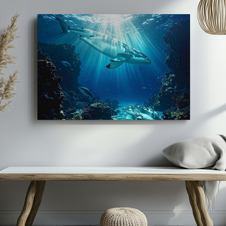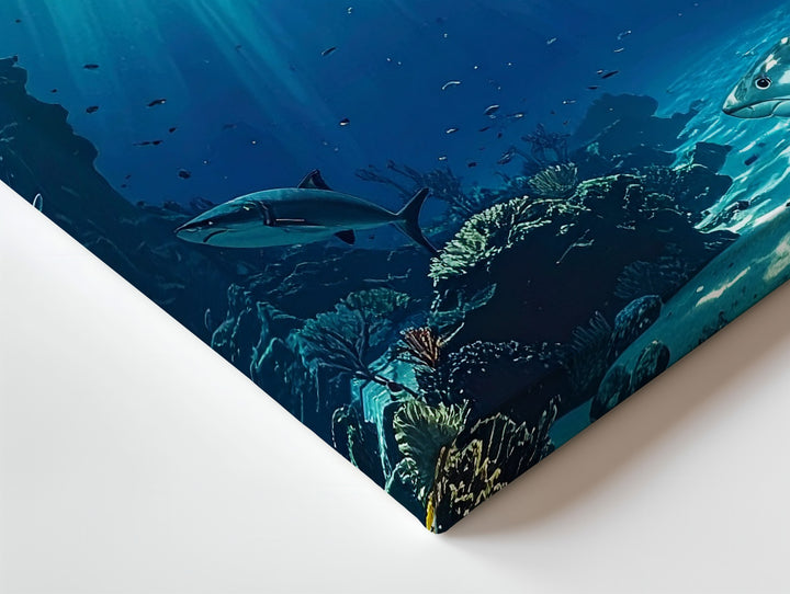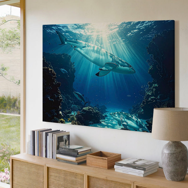 Cinematic Shark Channel Canvas – Dramatic Underwater Ocean Scene