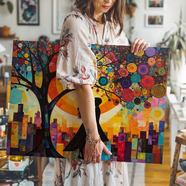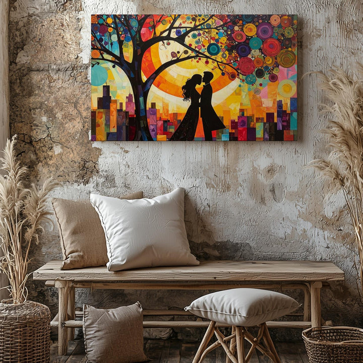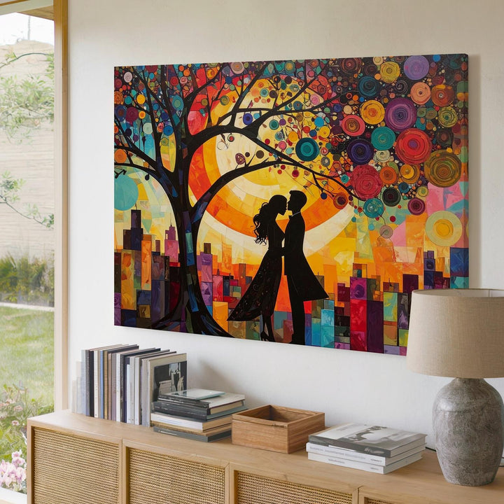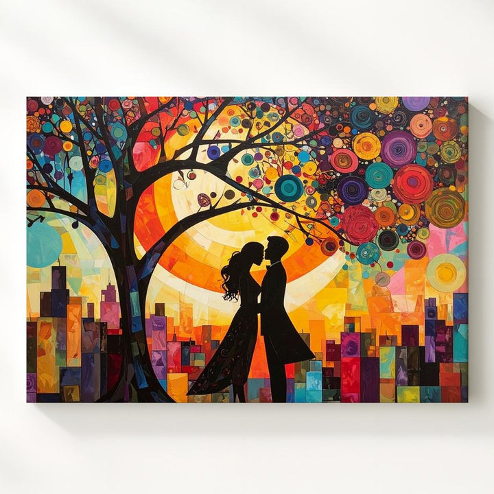 This colorful canvas captures a romantic moment shared by a couple standing close beneath a stylized tree, set against a lively cityscape. The figures, silhouetted in black, create a striking contrast against the backdrop filled with circular patterns, geometric shapes, and a glowing sun in hues of orange, teal, pink, and yellow. The tree’s branches, adorned with multicolored orbs and stylized leaves, add a touch of whimsy and life to the scene. This piece blends urban energy with natural beauty, evoking a sense of intimacy, love, and the magical harmony that exists between city life and nature.