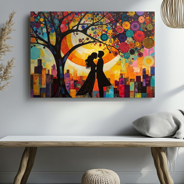 City Love Under the Tree Canvas – Romantic Urban Scene with Vibrant Colors