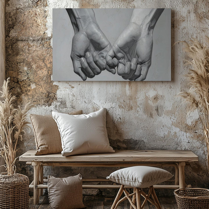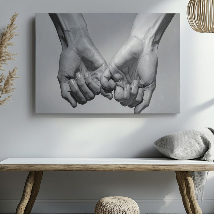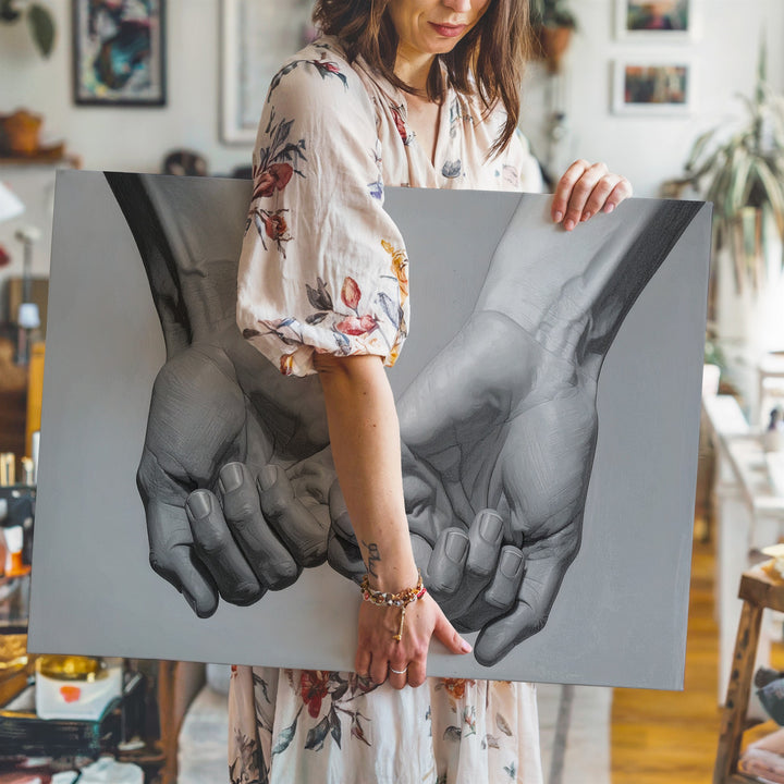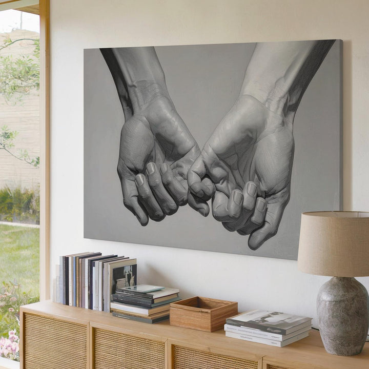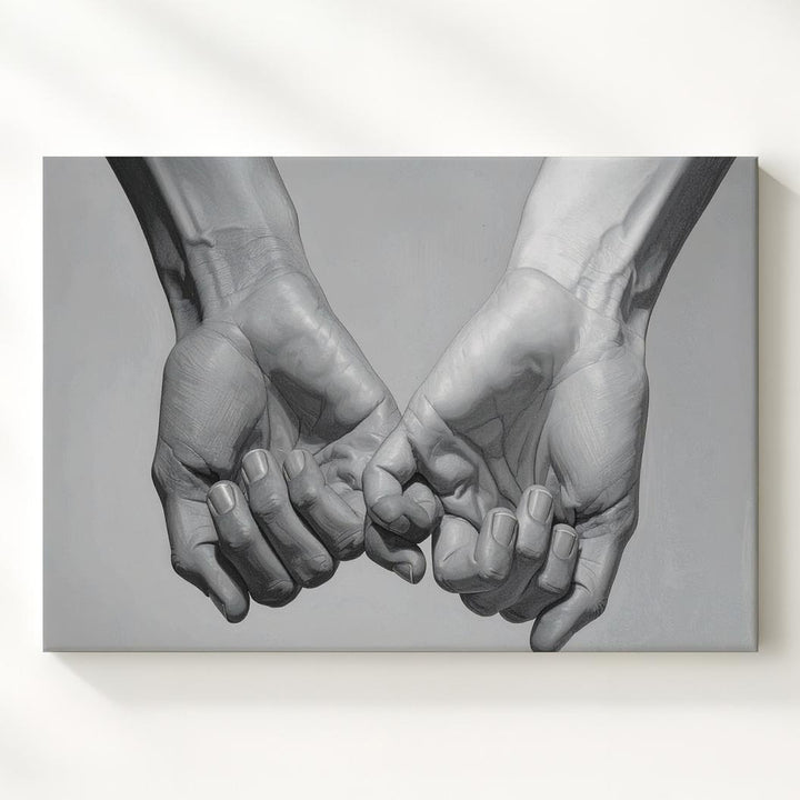 This beautifully detailed grayscale canvas captures the tender clasp of two hands, their fingers gently intertwined in a gesture that speaks of unity, trust, and emotional closeness. Rendered with high anatomical accuracy and soft shading, the hands emerge from a subtle gray gradient, focusing attention on their delicate connection. This intimate, romantic gesture, more delicate than a firm handshake, embodies emotional warmth, making this piece a timeless symbol of love and trust in its simplest form.