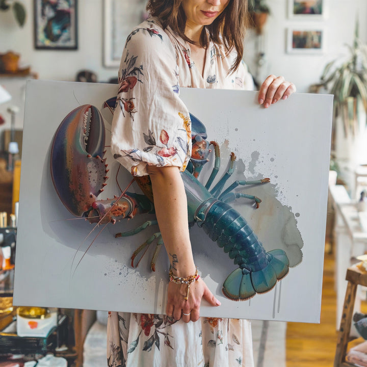 This striking watercolor canvas showcases a lobster like you’ve never seen it—painted in bold, iridescent splashes of red, blue, and green. With claws raised and antennae gracefully extended, its form combines structural strength with expressive motion. Radiating pigment bursts from its center, adding dynamic energy to the clean white background. It’s a celebration of marine intensity and artistic freedom, where nature meets bold imagination.