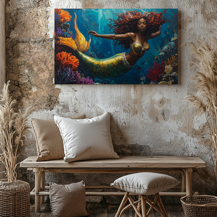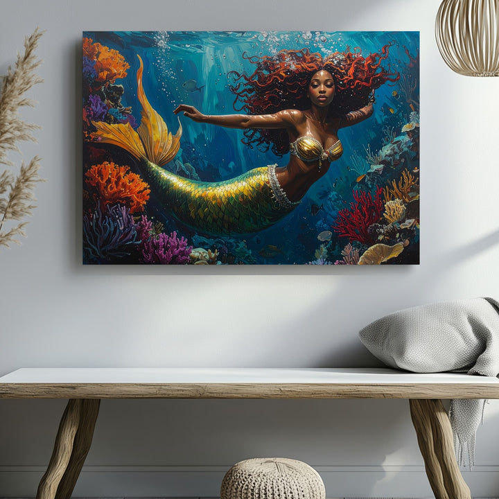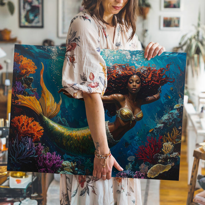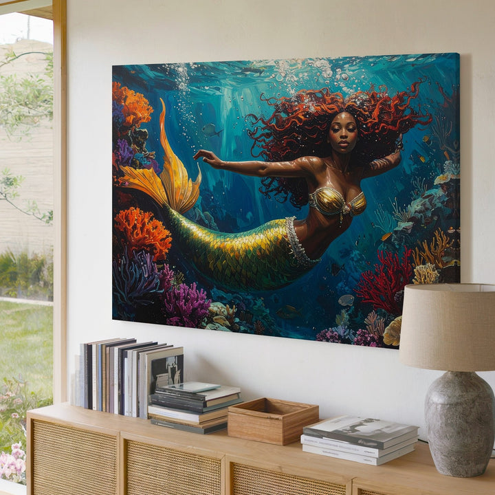 Dive into a whimsical underwater world where color, motion, and imagination collide. A radiant mermaid with a golden-green tail and flowing red curls glides joyfully through a vibrant coral reef. Surrounded by bright marine life and textured formations in orange, purple, and crimson, she brings energy and wonder to every corner of this fantastical scene. Bubbles and teal-toned lighting add movement and magic, turning the ocean into a living dream.
