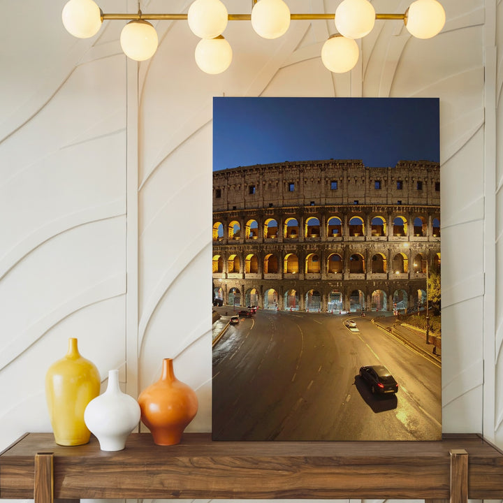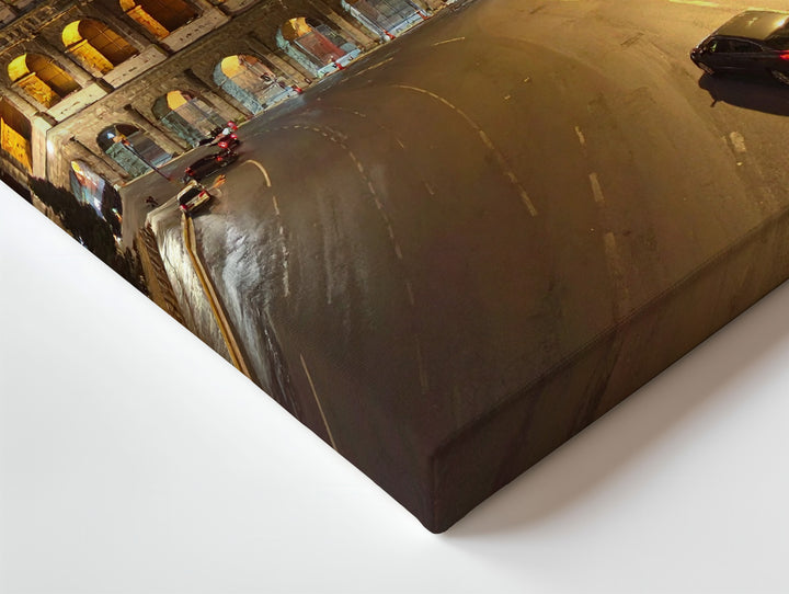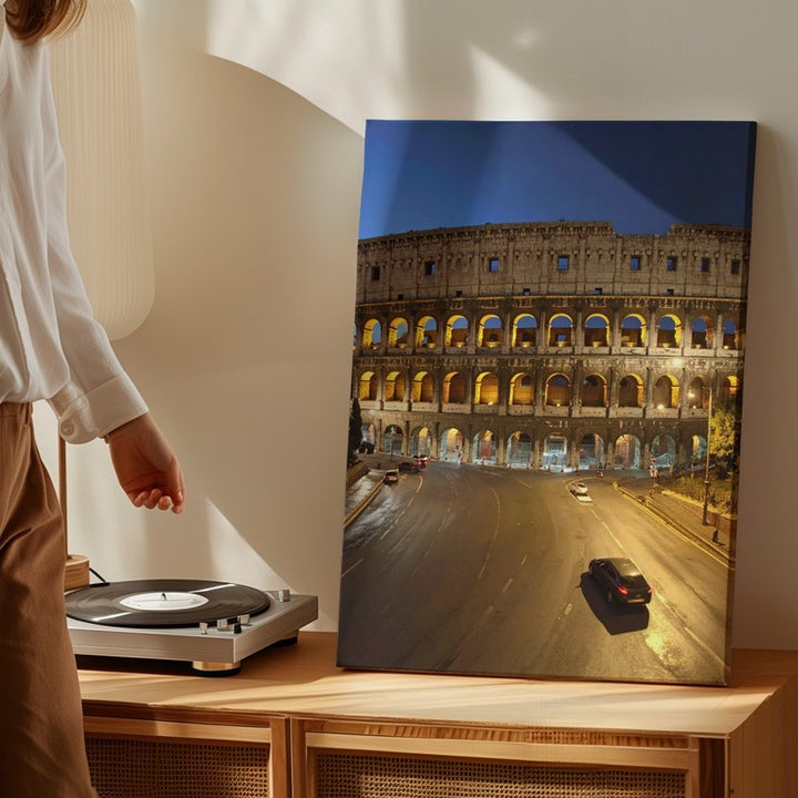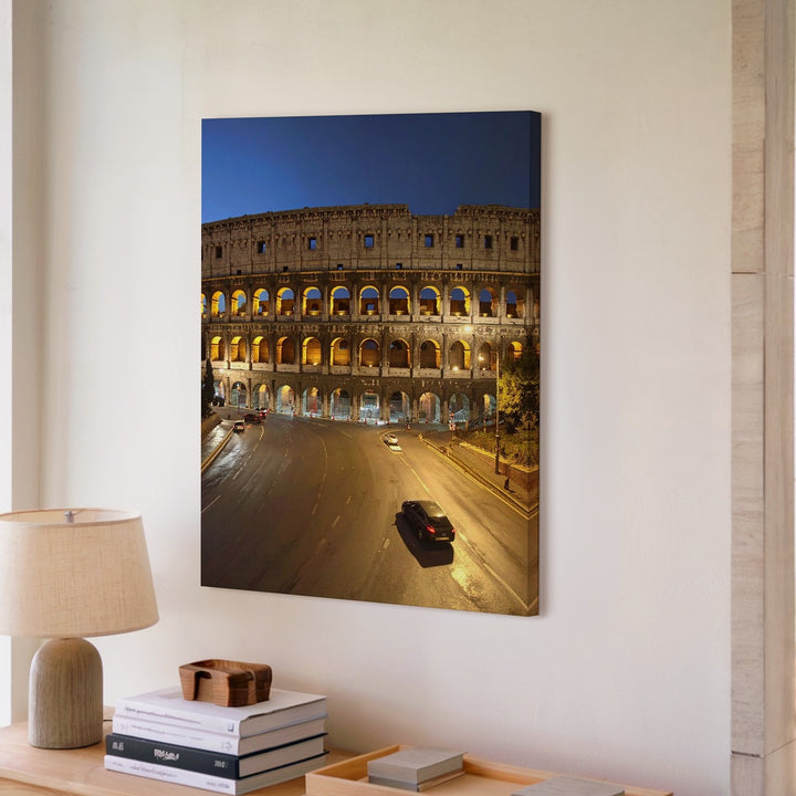 Colosseum Night Canvas – Illuminated Roman Amphitheater with Modern Street