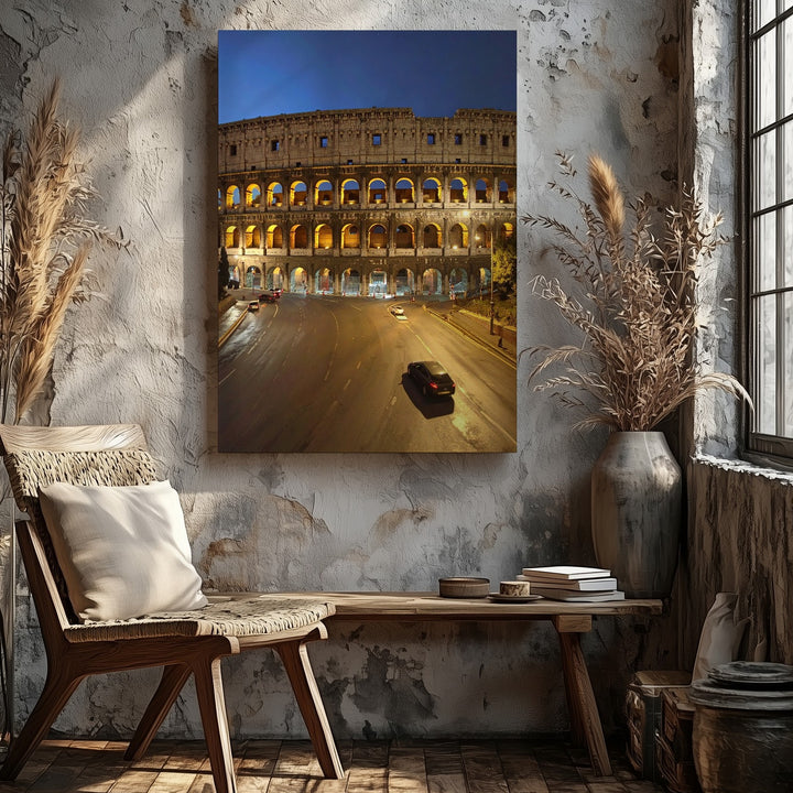This stunning canvas captures the Colosseum illuminated by golden floodlights, its majestic arches glowing against the deep blue sky. The worn texture of the stone is beautifully highlighted, evoking the age and history of this iconic structure. In the foreground, a modern street curves around the monument, with cars parked and moving, subtly blending the old and new. The warm lights from the Colosseum contrast with the cool tones of the sky, enhancing the monument's grandeur and the sense of timelessness. The peaceful yet majestic atmosphere honors the enduring legacy of Roman civilization.