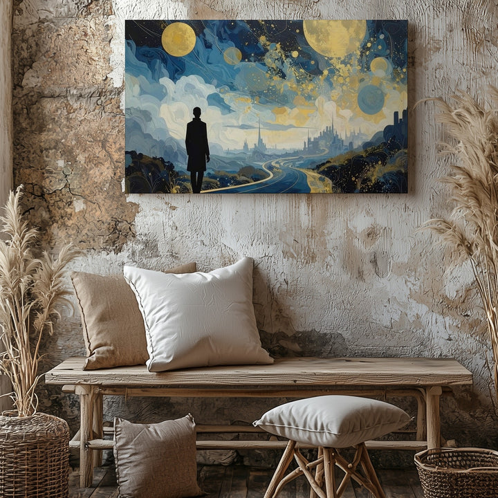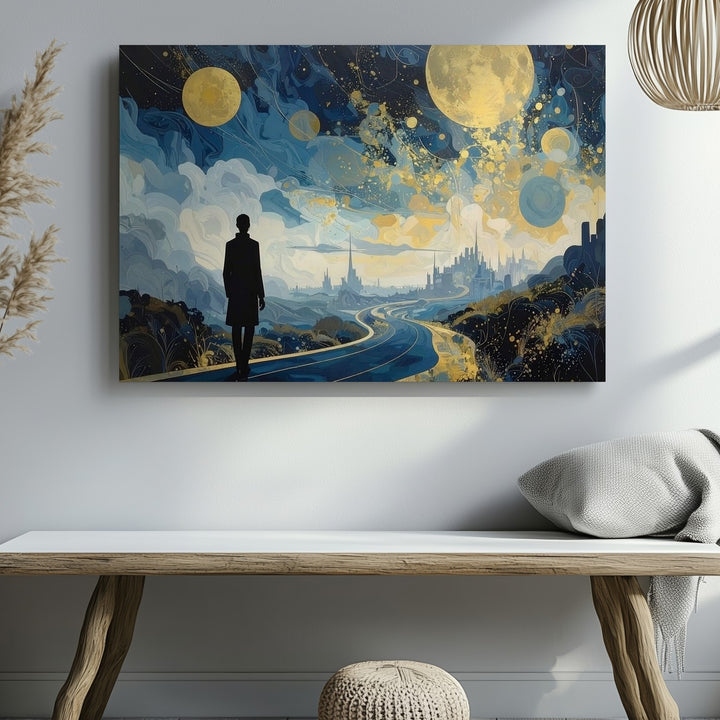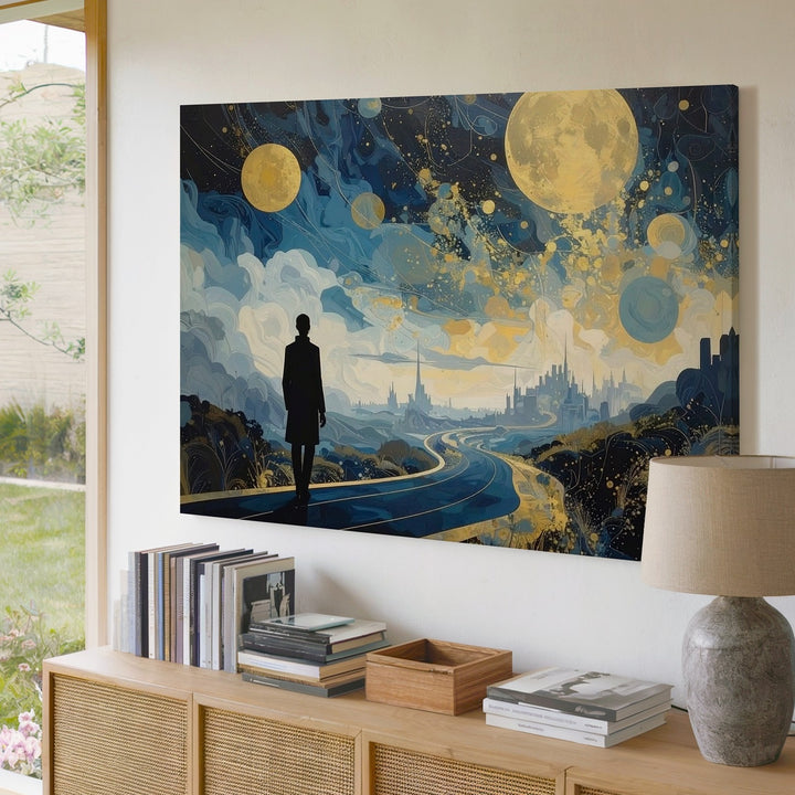 This surreal canvas invites you to walk a winding path beneath glowing golden moons and abstract clouds, where a lone silhouette faces a distant, whimsical city. Bathed in deep blues, soft whites, and radiant yellows, the scene evokes cosmic meditation, quiet discovery, and poetic mystery. It’s more than an image—it’s an invitation to explore your inner world with calm and wonder.