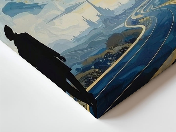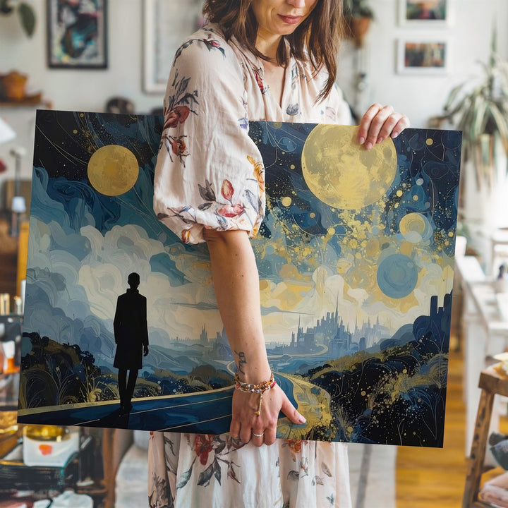 Cosmic Journey Canvas – Surreal Landscape with Golden Moons and Silhouette