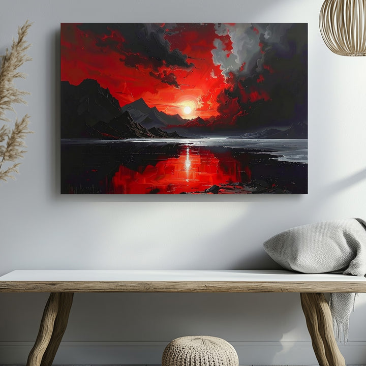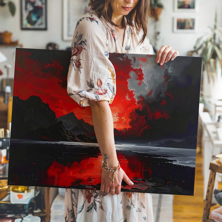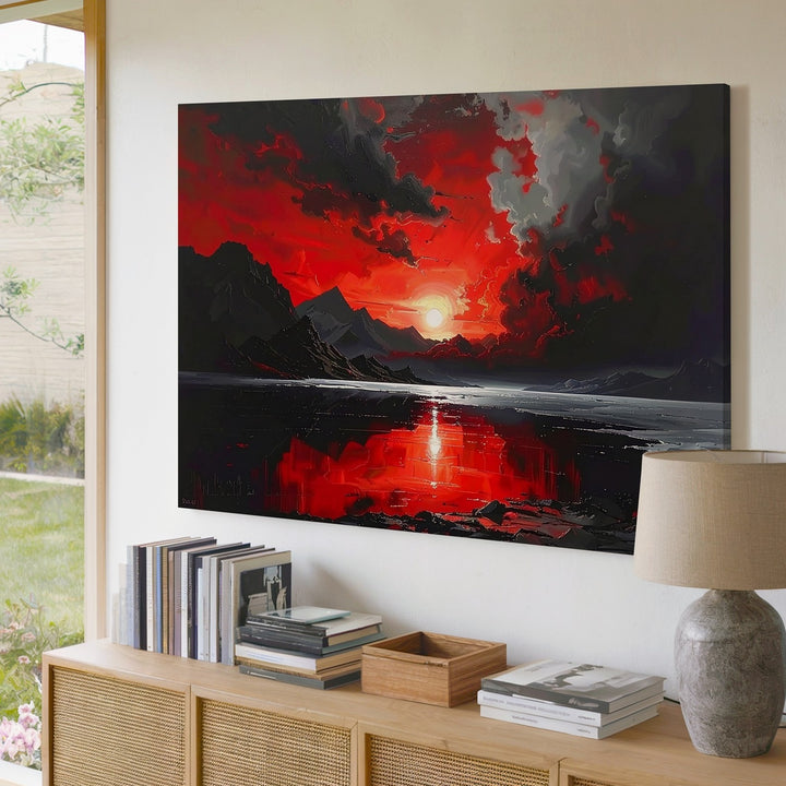 This powerful canvas captures a surreal and cinematic moment as jagged mountain peaks cut across a sky ablaze in deep crimson and shadow. Swirling storm clouds and a glowing lake reflection echo the sky’s fire, casting intense reds and blacks across a landscape filled with mystery and awe. With mist-veiled summits and a mirror-still foreground, this piece evokes a world on the edge of the known—striking, bold, unforgettable.