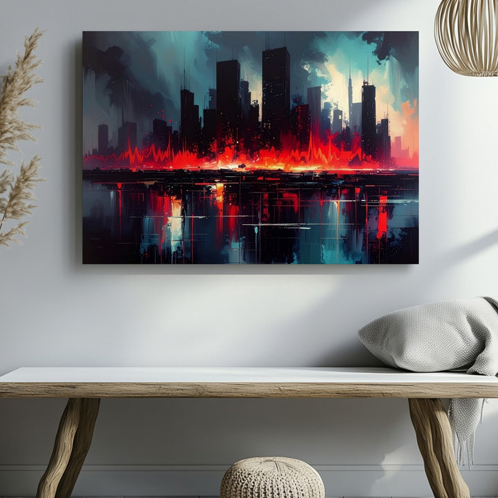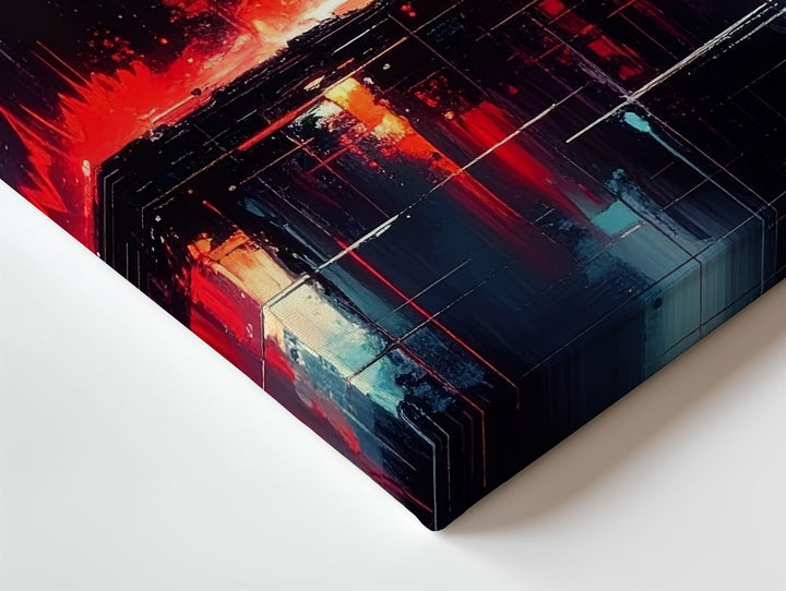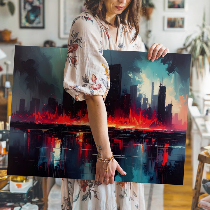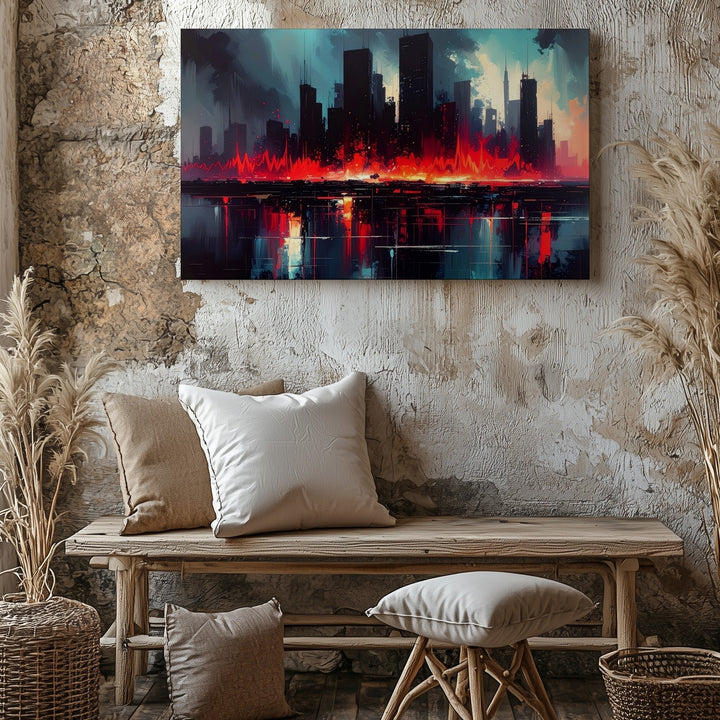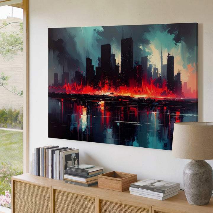 This striking cyberpunk canvas portrays a futuristic skyline cloaked in darkness, sliced by a glowing red band that beats like a digital heartbeat. Minimalist skyscrapers rise as dark silhouettes with subtle points of light, reflected and fractured below in rhythmic patterns. Deep blacks, dark teals, and intense crimson merge to create an intense, technological atmosphere—perfect for spaces craving bold modern energy and mystery.