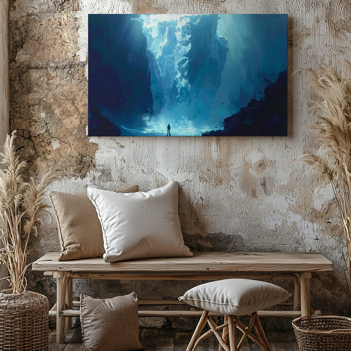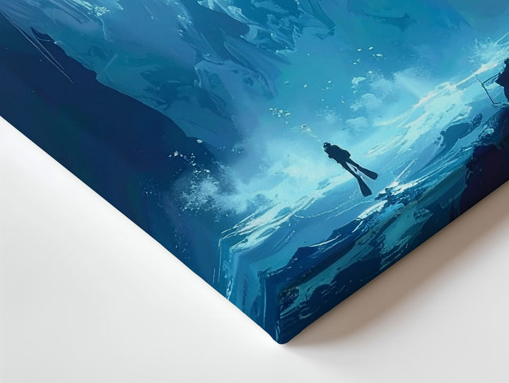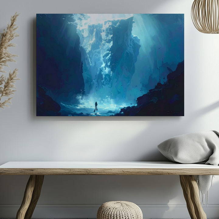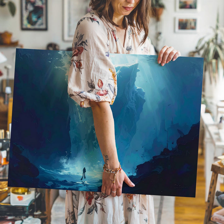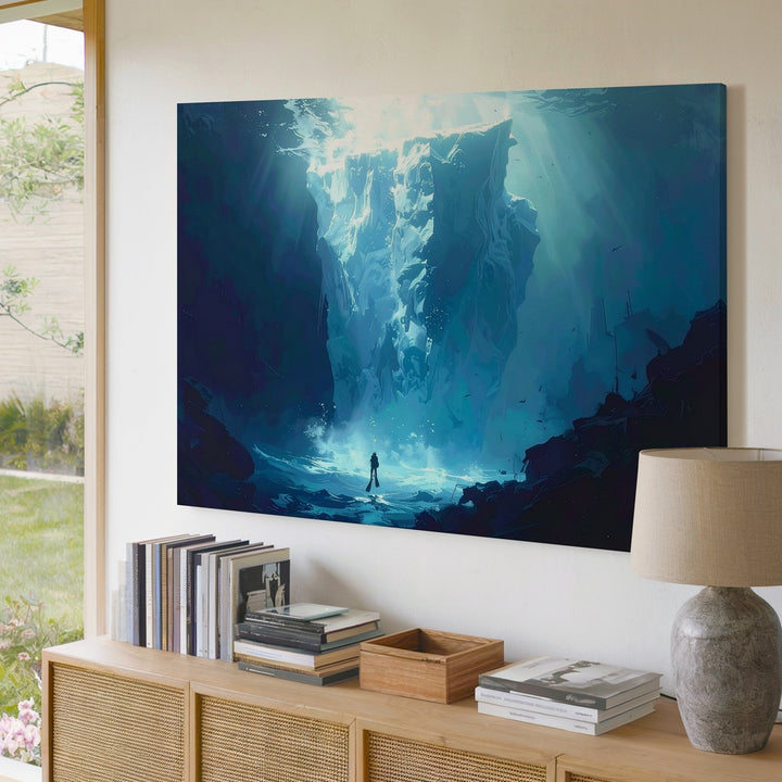 Into the Abyss Diver Canvas – Moody Underwater Iceberg Exploration Art