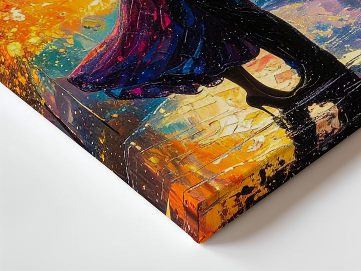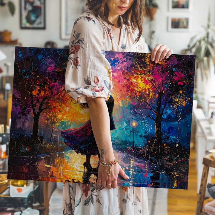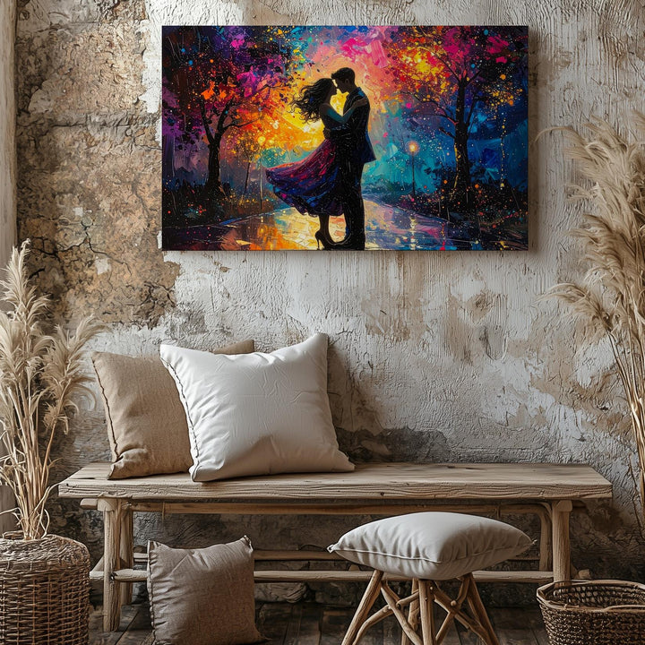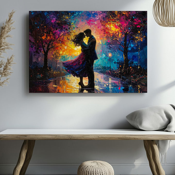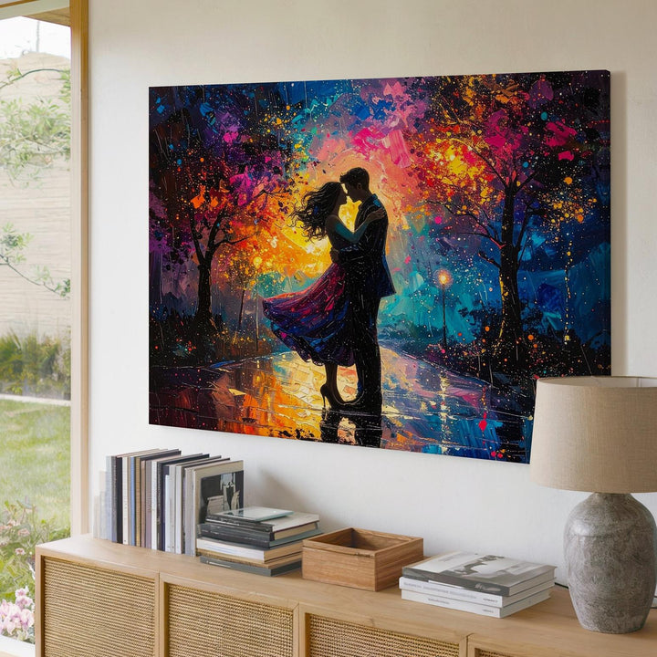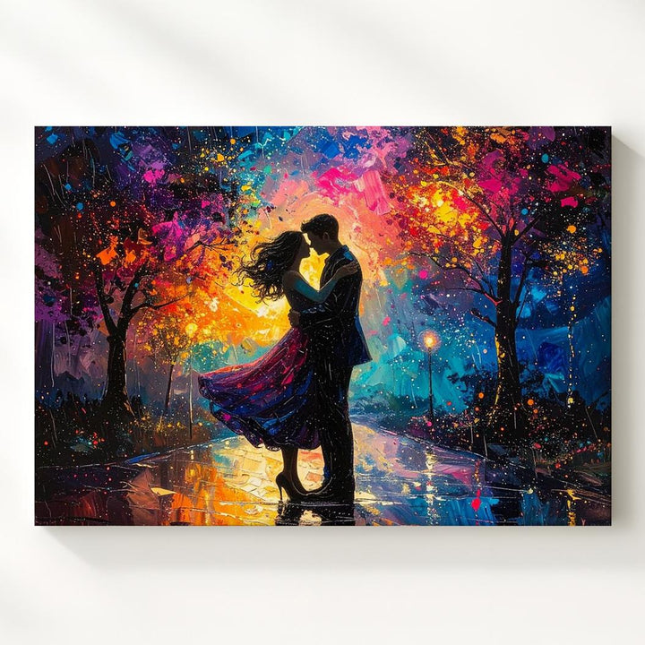 Dreamy Rain Embrace Canvas – Romantic Couple in Neon Lights