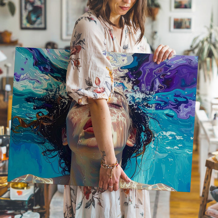 This evocative canvas captures a woman partially submerged, her face gently tilted upward beneath rippling, marbled water in shades of purple, teal, and white. Her closed eyes and parted lips convey serene introspection, while the fluid distortions blend realism with painterly textures. A dreamy, emotionally charged composition that explores immersion, duality, and the quiet escape beneath the surface.