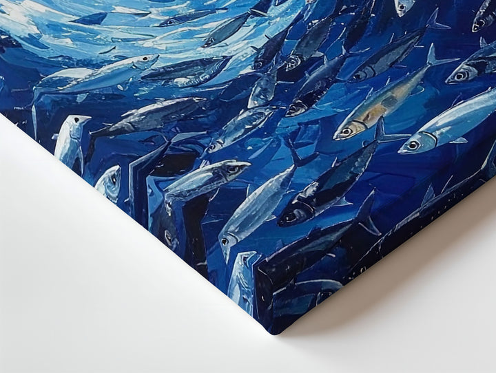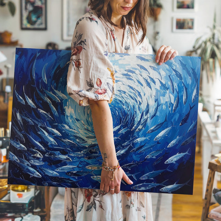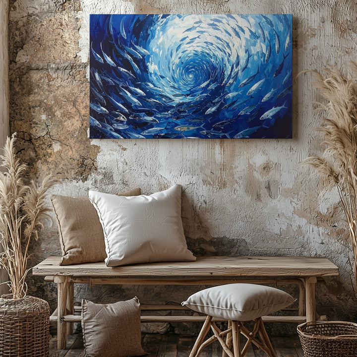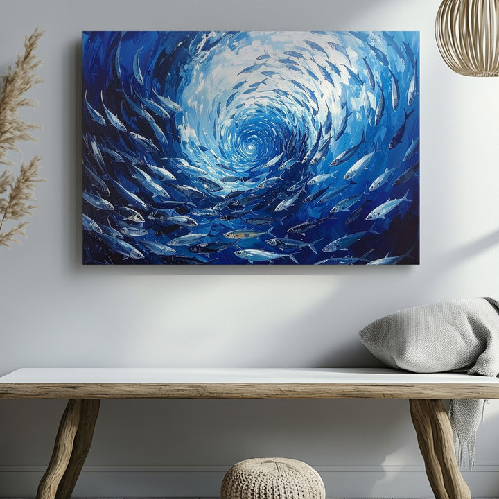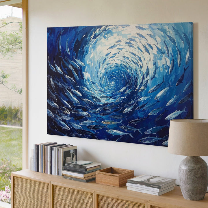 Dynamic Spiral School of Fish Canvas – Mesmerizing Ocean Motion Art