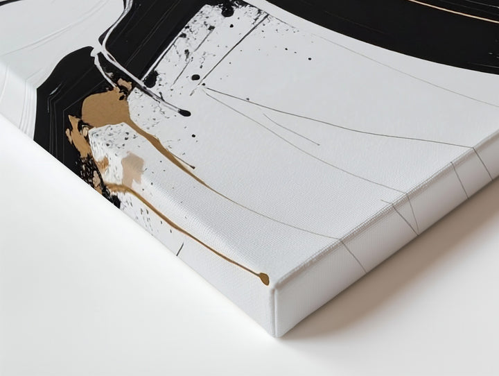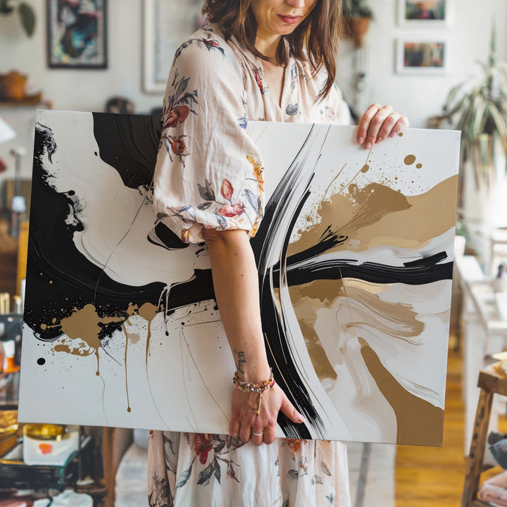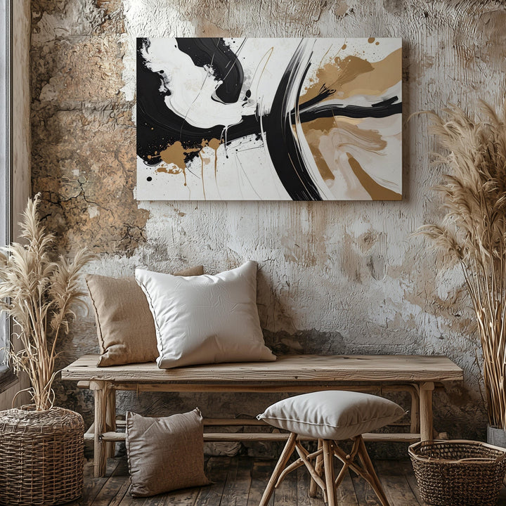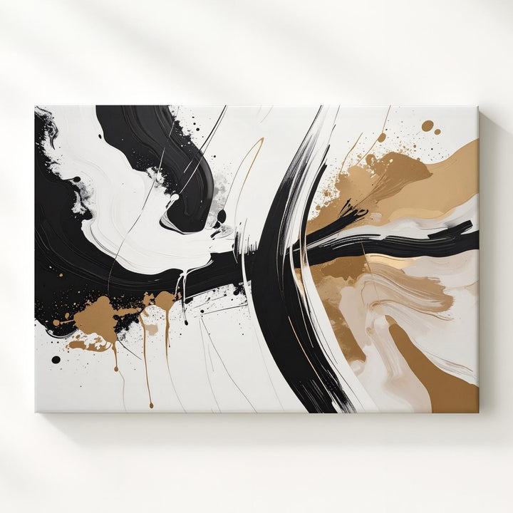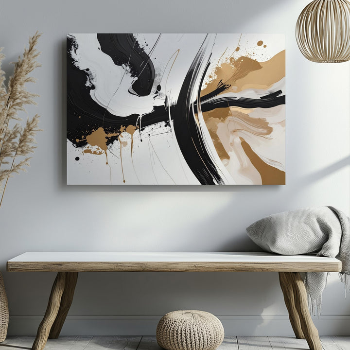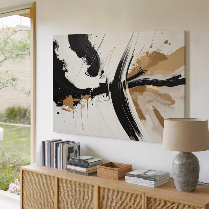 This expressive abstract canvas features a powerful black arc flowing vertically against a crisp white background, intertwined with warm tan and white brushstrokes that create rhythm and contrast. The painterly textures, bleeding edges, and subtle speckles evoke raw energy and spontaneity, balancing dense color with open space. A dynamic statement piece that captures emotion and flow—perfect for contemporary interiors that embrace abstract expression.