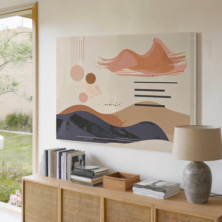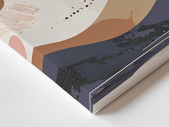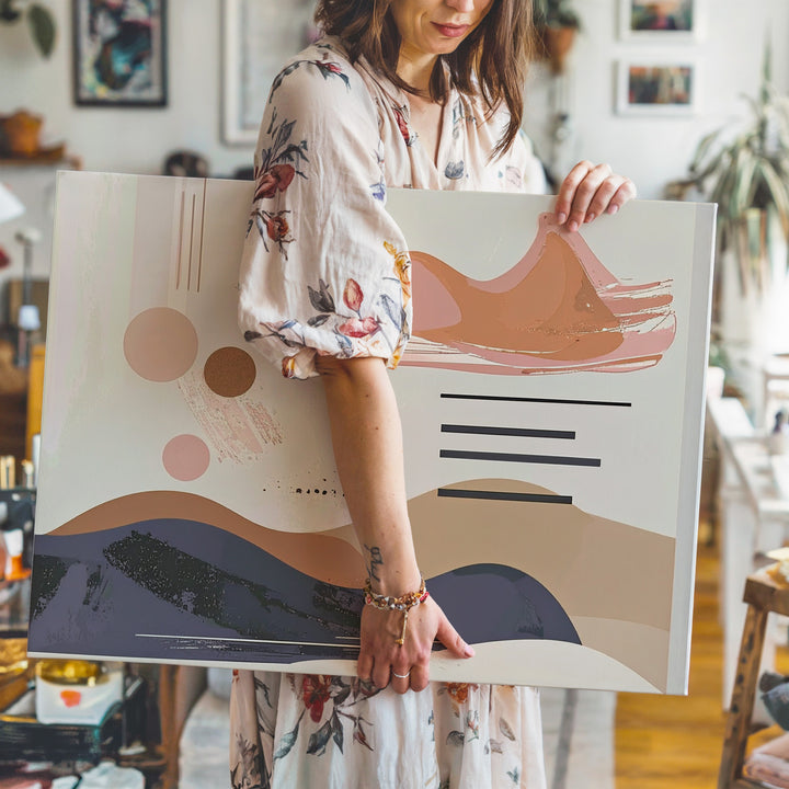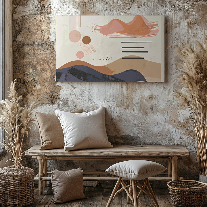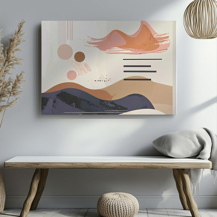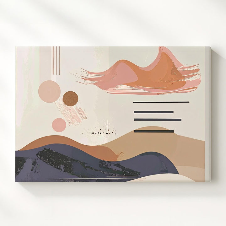 This modern minimalist canvas blends organic curves and geometric simplicity in a palette of warm terracotta, peach, deep brown, and soft beige. Asymmetrically arranged across a nude background, its brushstroke-like forms and abstract cutouts create gentle visual rhythm and grounding calm. With its earthy hues and soft-edged balance, this artwork invites peace, playfulness, and subtle sophistication into any contemporary space.