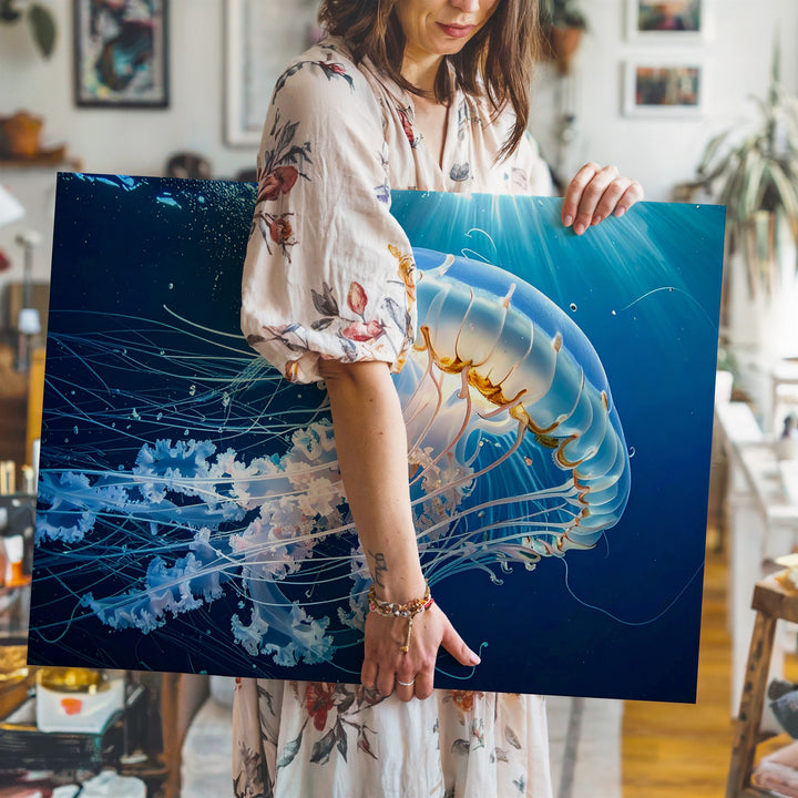 This mesmerizing underwater canvas captures a luminous jellyfish drifting through deep blue waters. Its translucent bell glows with a soft light, while its long tendrils trail like silk through the sea. Suspended bubbles and gentle particles add texture and motion, while dramatic lighting highlights the jellyfish’s delicate form. The result is a composition that feels both tranquil and otherworldly—an elegant portrait of ocean mystery.