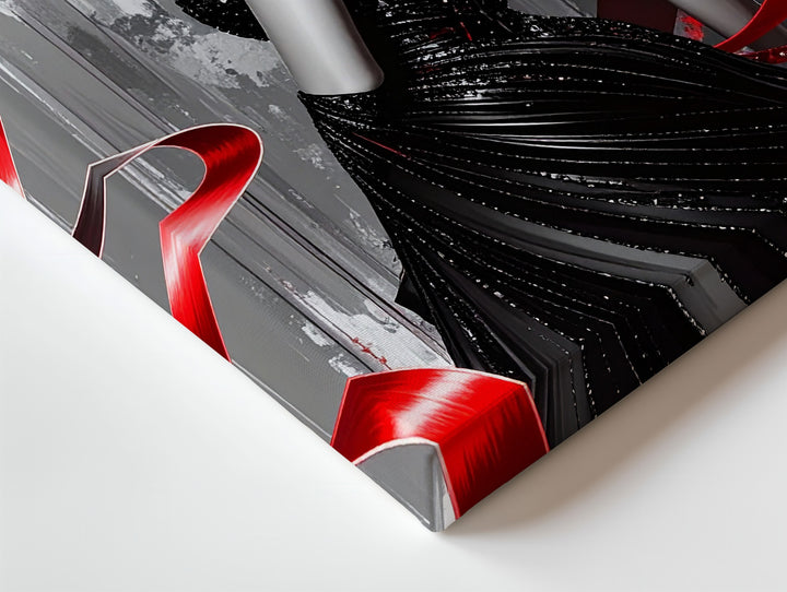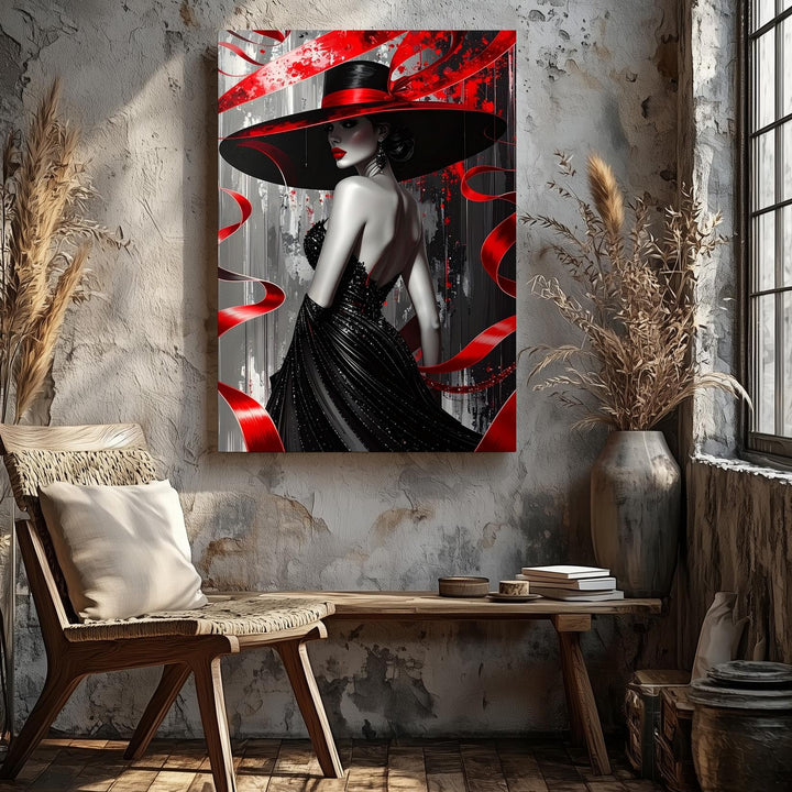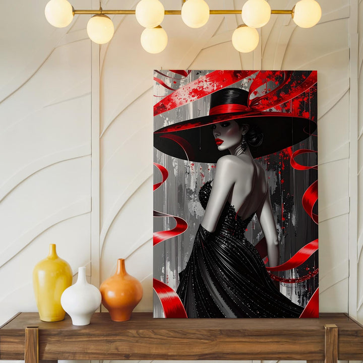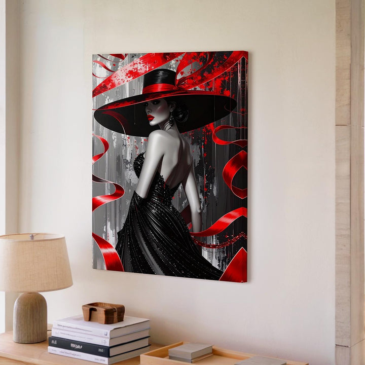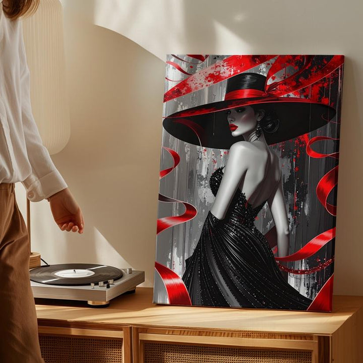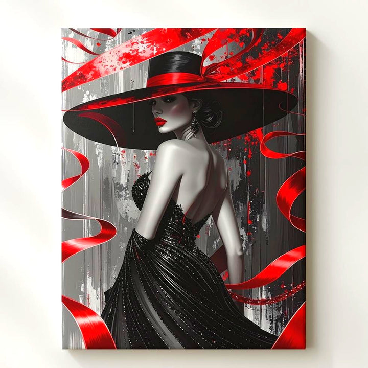 This stylized canvas features an elegant woman in a black evening gown, captured in profile with a dramatic red hat casting a shadow over her eyes. The flowing red ribbon wraps around her arms and torso in a dynamic swirl, creating a striking contrast against the sleek, monochrome dress and background. The bold, high-contrast design exudes sophistication and mystery, while the graceful curve of her back and minimalist color palette contribute to a visually powerful and fashion-forward aesthetic.
