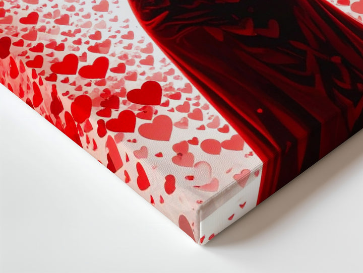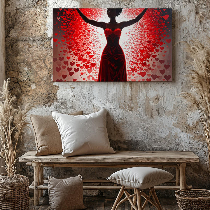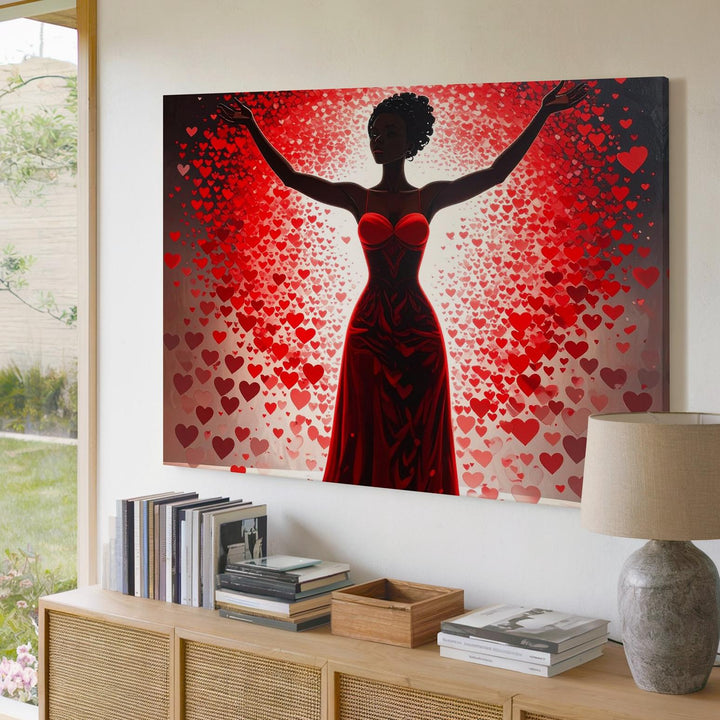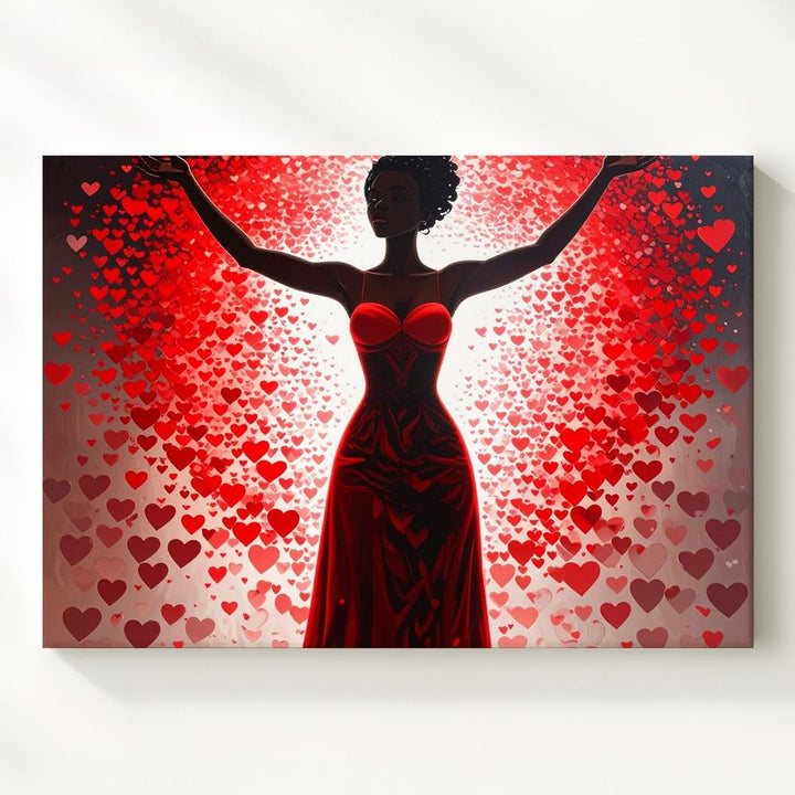 This striking canvas features a silhouette of a woman with her arms raised in joy, set against a glowing red background filled with an explosion of heart shapes. The woman’s flowing dress and the radiant burst of hearts evoke a sense of celebration, personal strength, and emotional liberation. The central red glow fades into darker tones at the edges, creating a dramatic vignette that enhances the intensity of the scene. This piece symbolizes love as a powerful, self-expressive force, bringing both emotional depth and vibrant energy to any space.