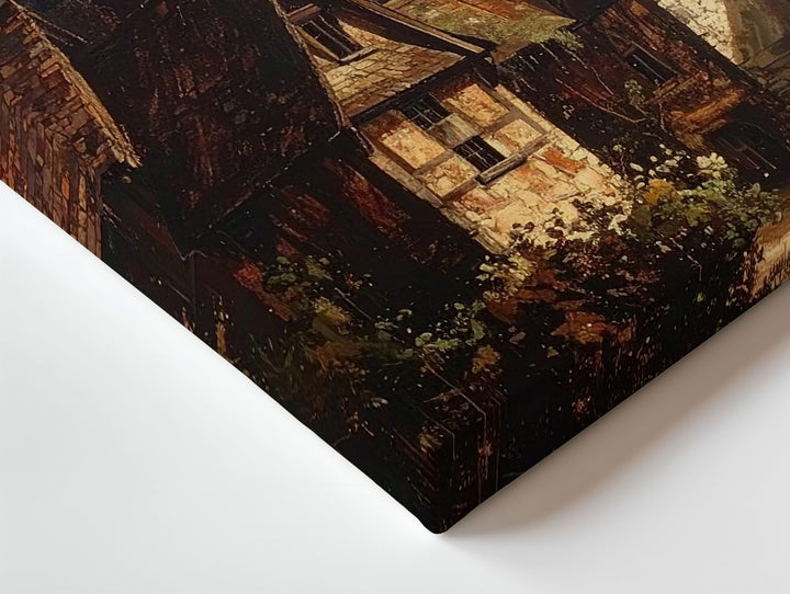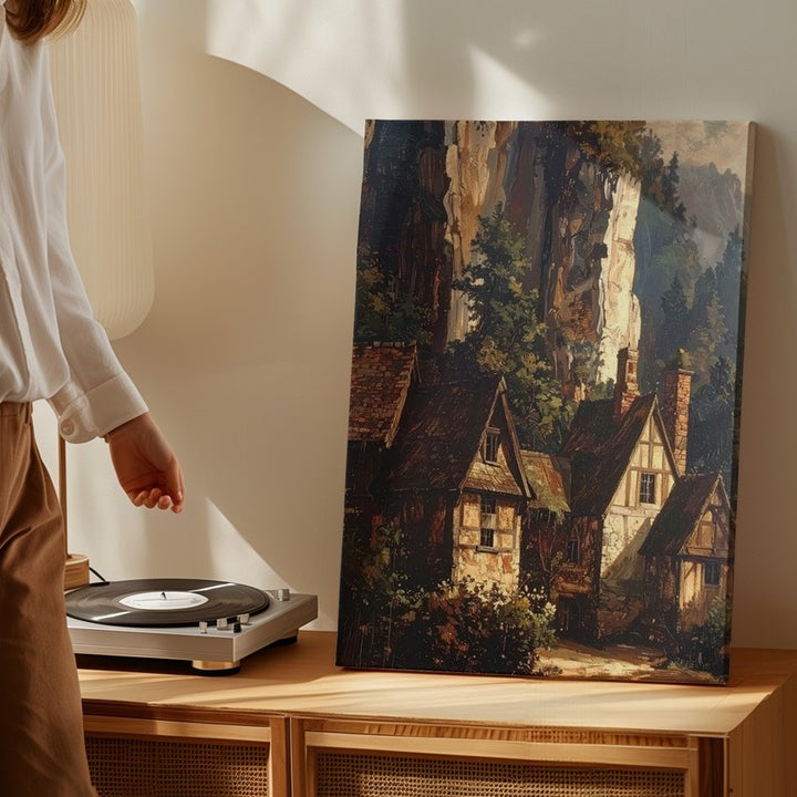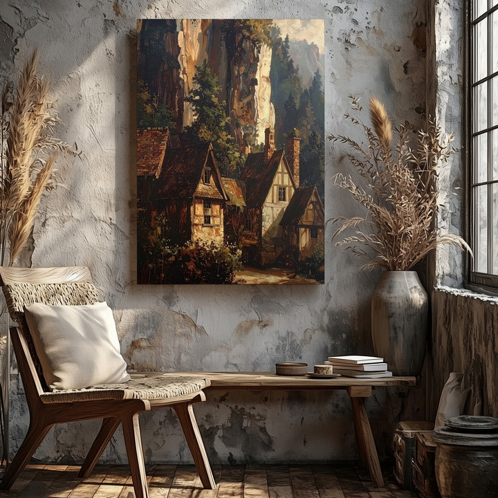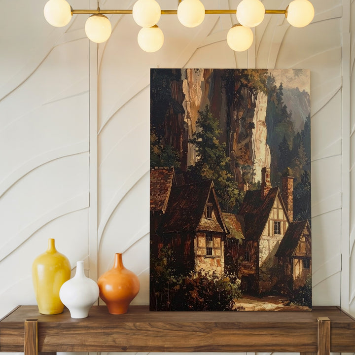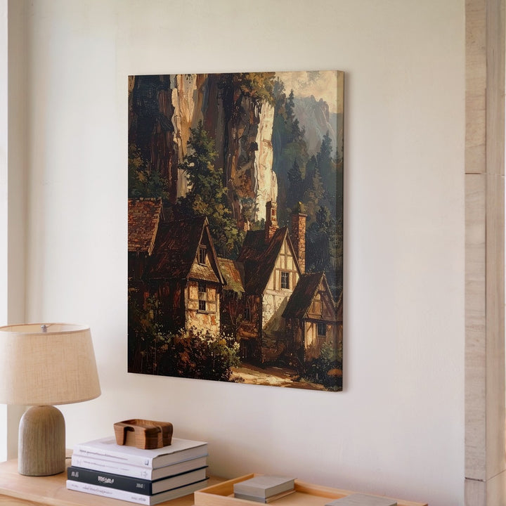 Enchanted Cliffside Village Canvas – Textured Medieval Forest Scene